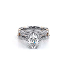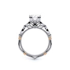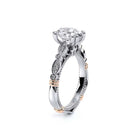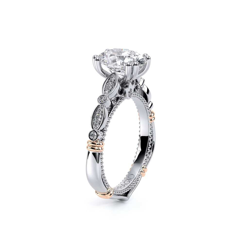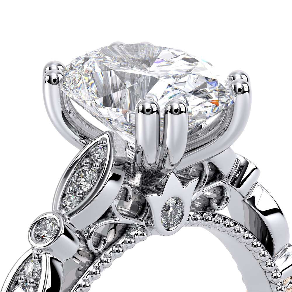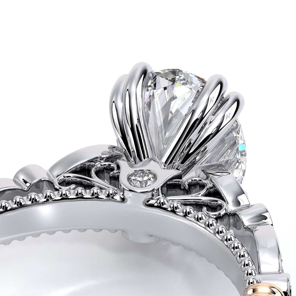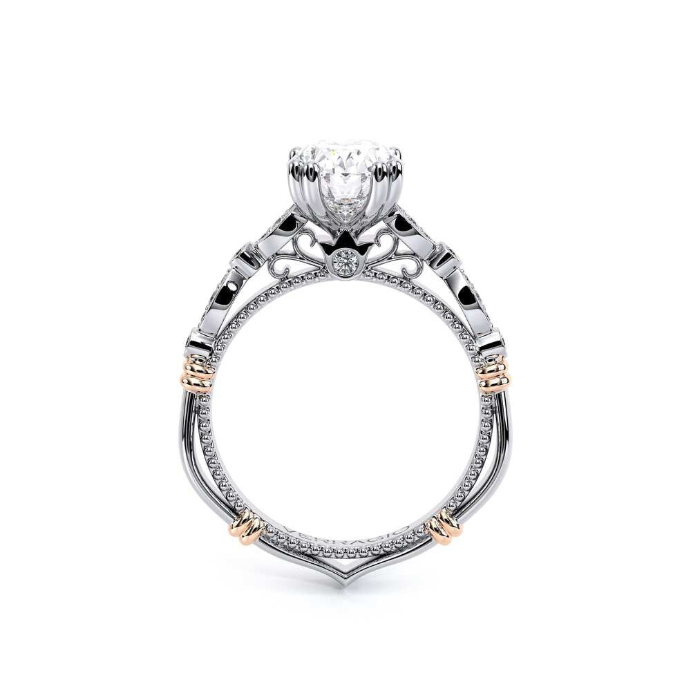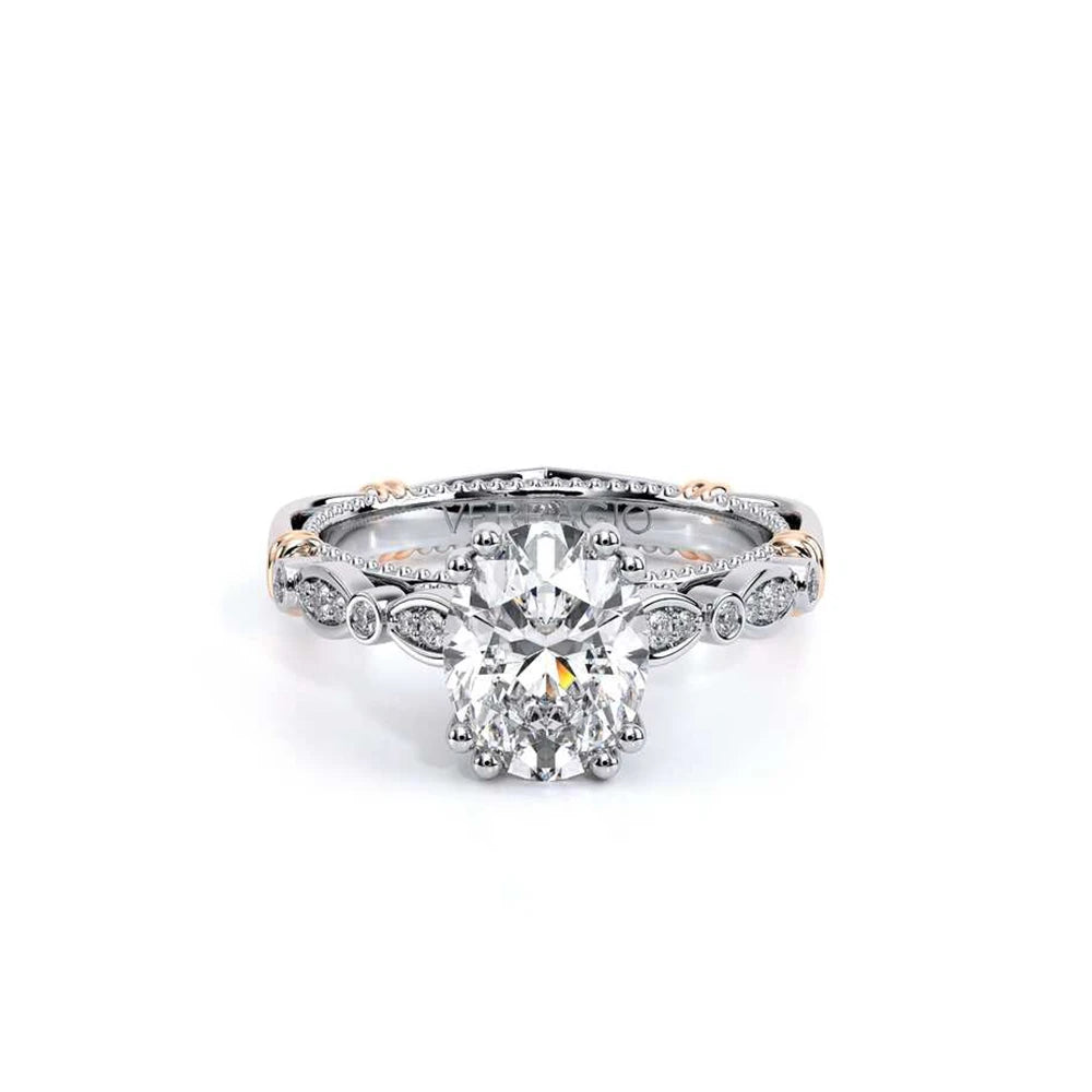 PARISIAN-100OV is a vintage inspired engagement ring that focuses on the unique bezel set round brilliant-cut diamonds on the straight band, adorned handcrafted Parisian lace and rose gold Timeless wraps all dedicated to enhance the oval center.