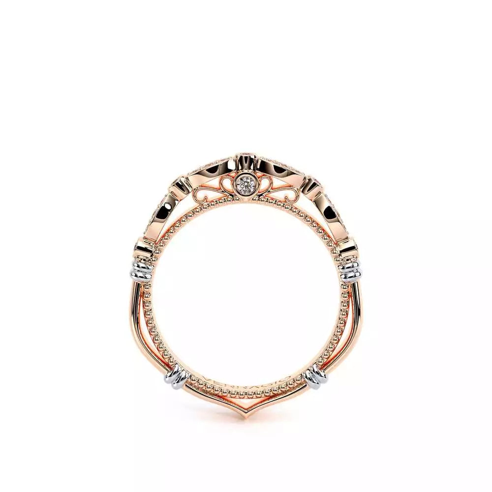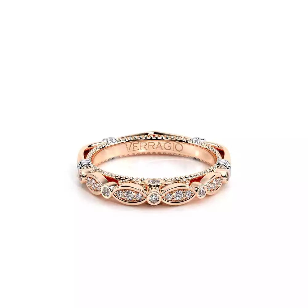 PARISIAN-100W wedding band carries through the beautiful scalloped bezel set diamonds on the band, adorned with rose gold Parisian lace and Timeless wraps details to compliment your Verragio engagement ring perfectly. **Note: +$400 for Lace, Beading or Both in a different color
