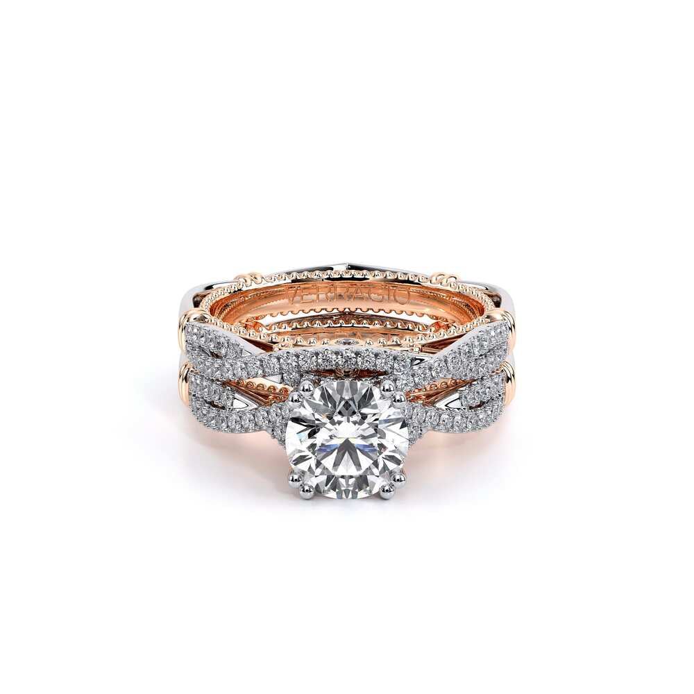 Parisian-105R is a beautifully handcrafted twisted style engagement ring that features the Parisian Lace detail, wrapped in our Verragio signature beading and adorned with rose gold Timeless wraps.
