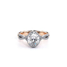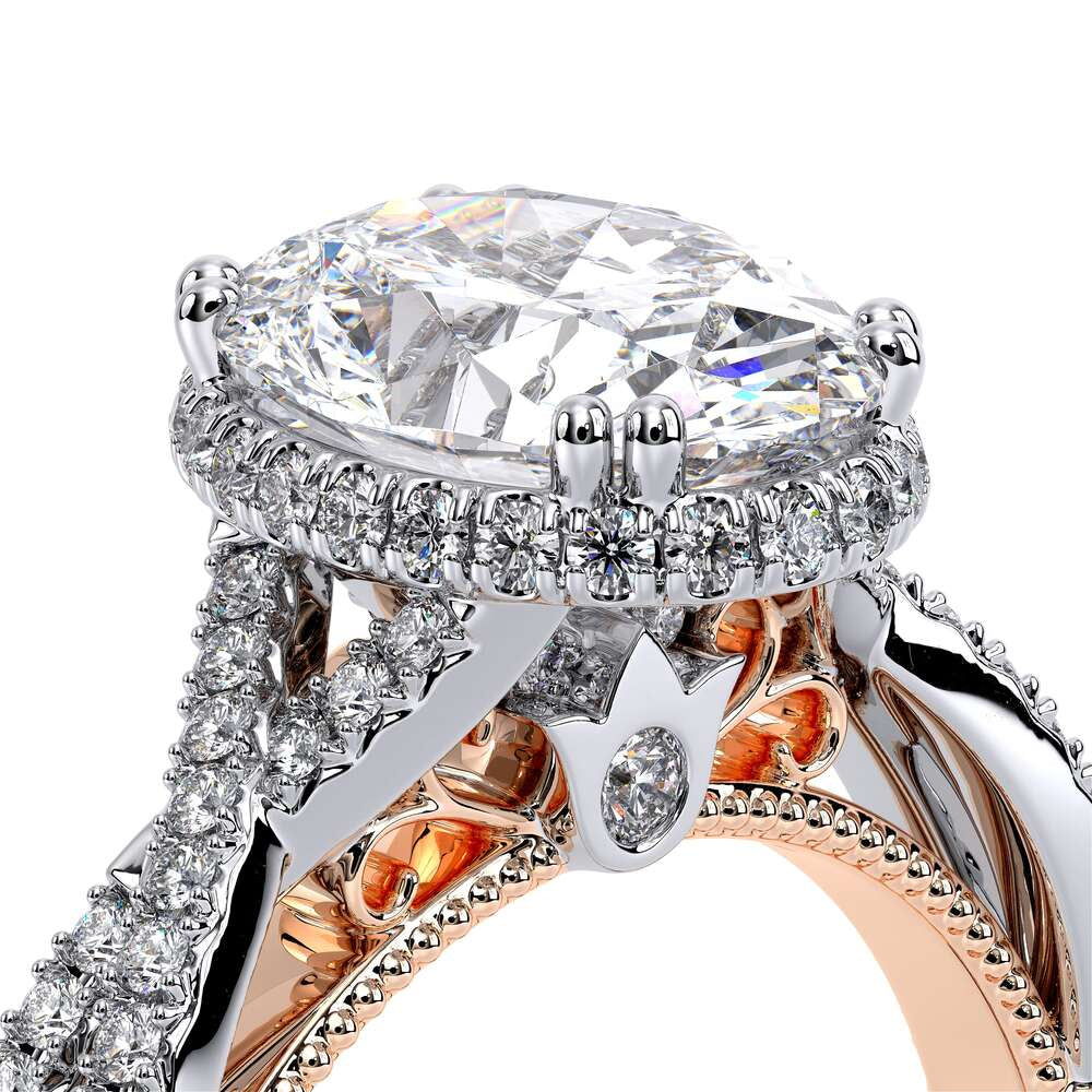 Parisian-105-XOV is a classic engagement ring that features pave set twisted diamond band showcasing our brand new Stardust Oval halo. The details continue to flow with the addition of Parisian Lace, our Verragio signature beading and lastly the rose gold Timeless wraps.