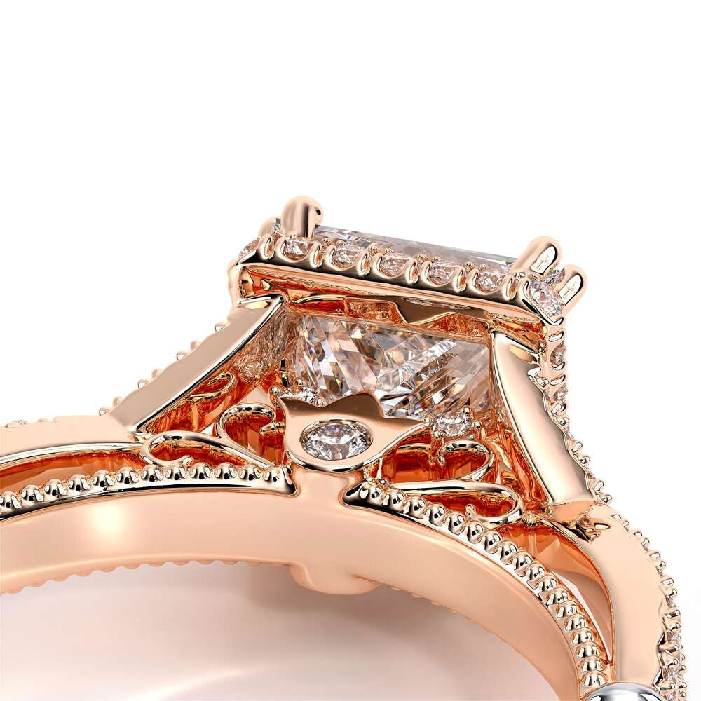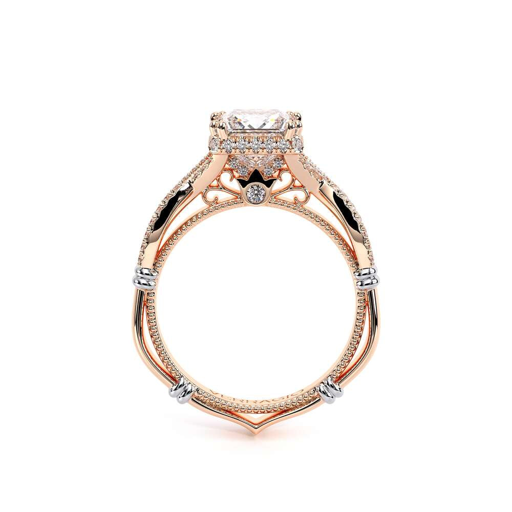 Parisian-105XP is a classic engagement ring that features pave set twisted diamond band showcasing our brand new Stardust princess halo. The details continue to flow with the addition of Parisian Lace, our Verragio signature beading and lastly the rose gold Timeless wraps.