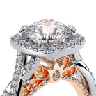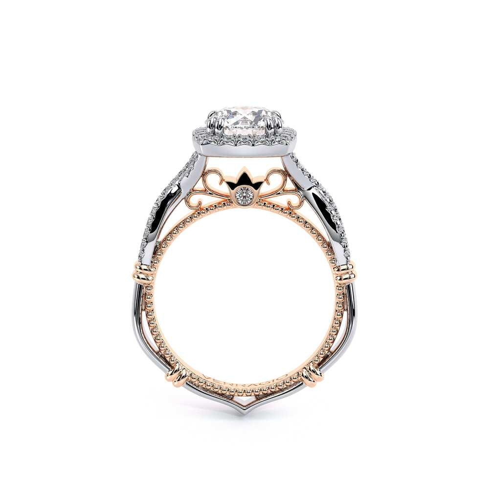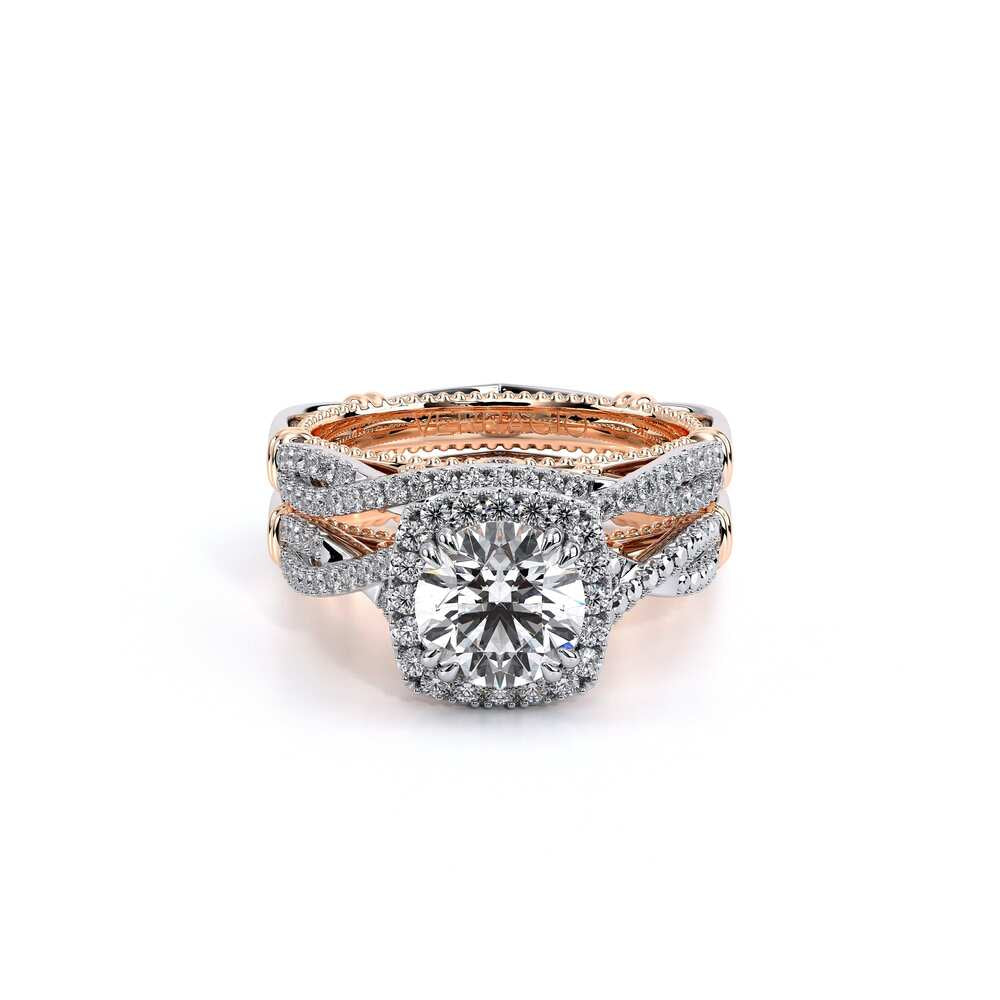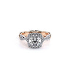 Parisian-106CU is a twisted style classic engagement ring that features a brilliant diamond cushion halo, Parisian Lace detail, our Verragio signature beading and lastly adorned with rose gold Timeless wraps.