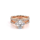 Parisian-124OV is the beautifully designed three-stone engagement ring of your dreams. Featuring the traditional look of the round brilliant side stones, Timeless wraps in rose gold and our elegant Verragio signature beading.