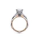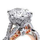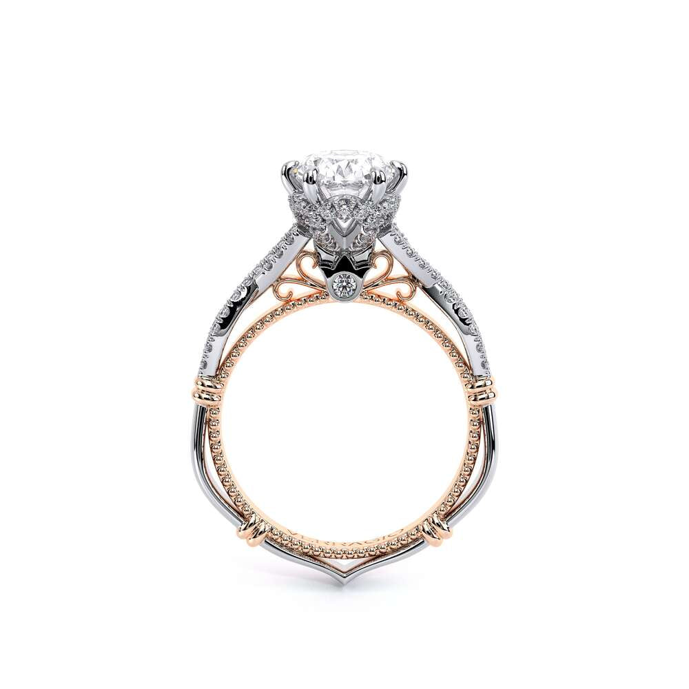 Parisian-153OV is a uniquely designed engagement ring that showcases Verragio' s diamond encrusted tiara that enhances a princess diamond center. The details continue through with the addition of the Timeless wraps, Parisian lace and Verragio signature beading.