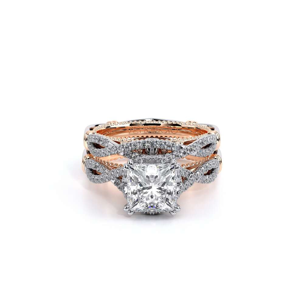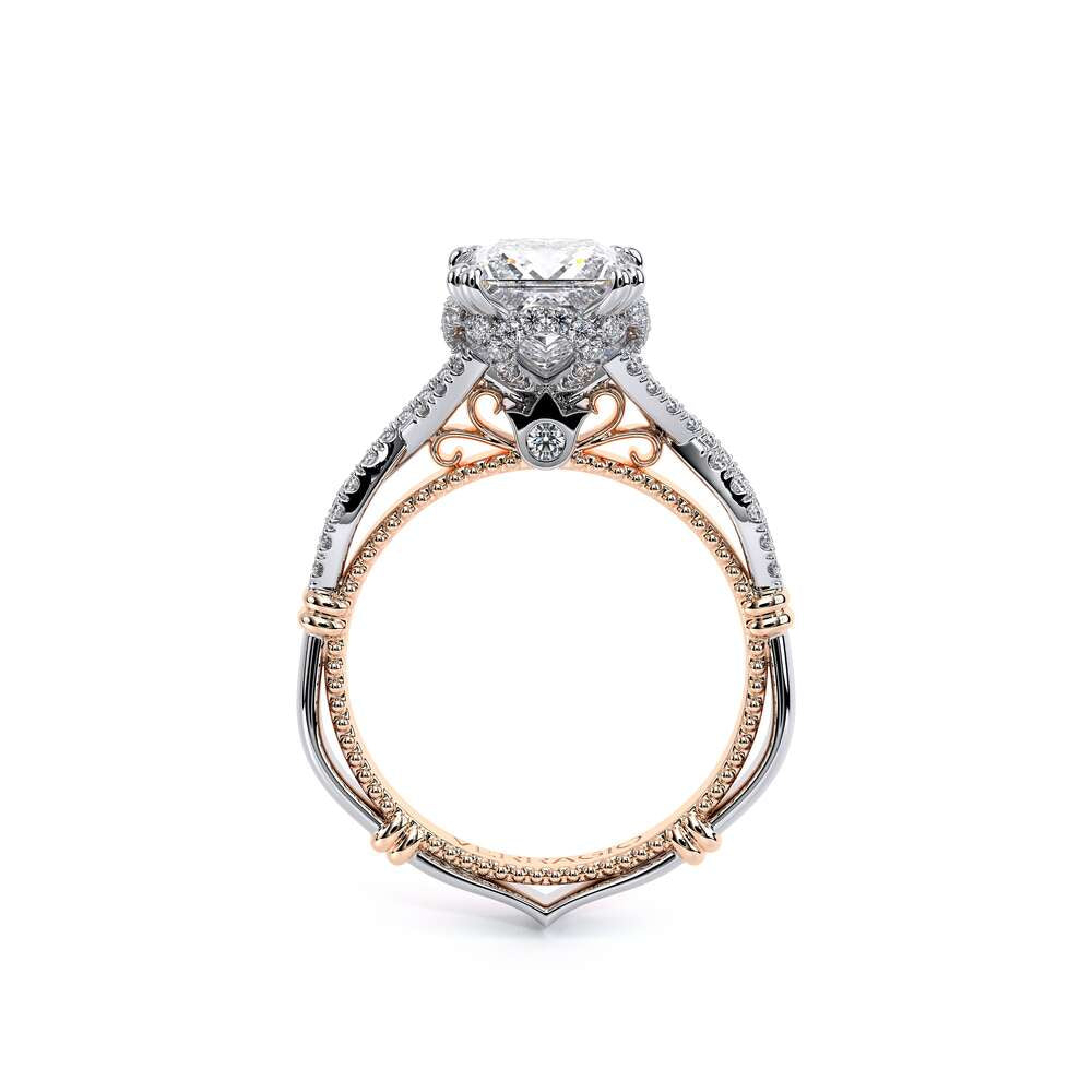 Parisian-153P is a uniquely designed engagement ring that showcases Verragio' s diamond encrusted tiara that enhances a princess diamond center. The details continue through with the addition of the Timeless wraps, Parisian lace and Verragio signature beading.