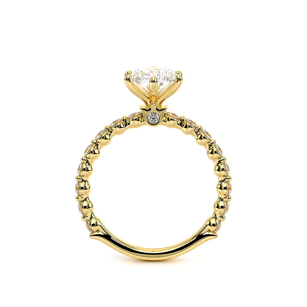 Renaissance-989OV-2.0 features a diamond-rich, four-prong setting meticulously crafted to cradle each stone securely. Its sleek, shared-prong cup setting exudes elegance, while the design ensures both comfort and durability. Verragio's signature crest unifies the sophisticated style.