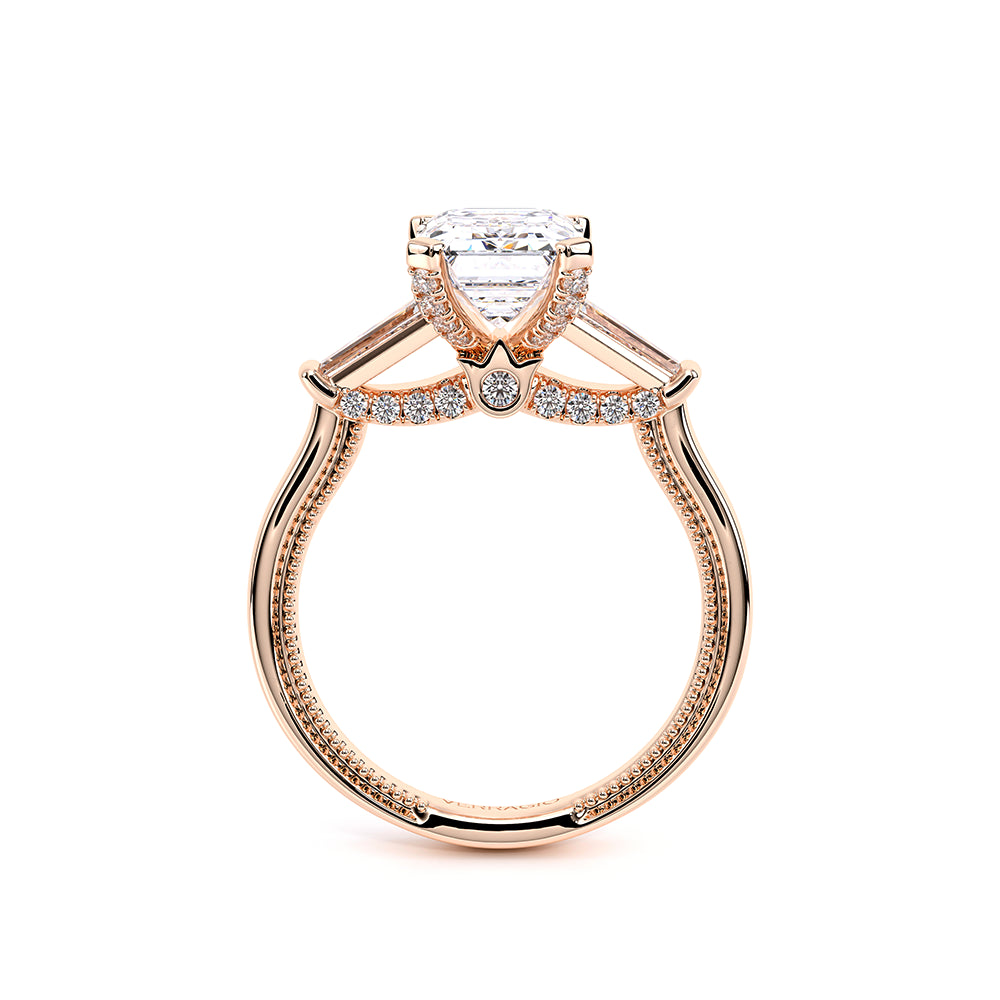 Renaissance-991EM-S is a captivating three-stone engagement ring featuring baguette diamonds. Pave diamonds beautifully frame your center stone; the simple shank adorned with delicate milgrain detail elevates this ring with vintage charm. The Verragio signature crest completes the refinement of this piece.