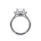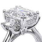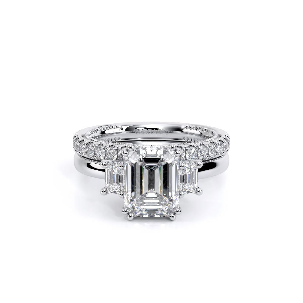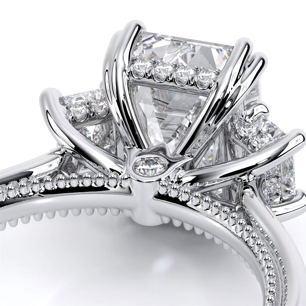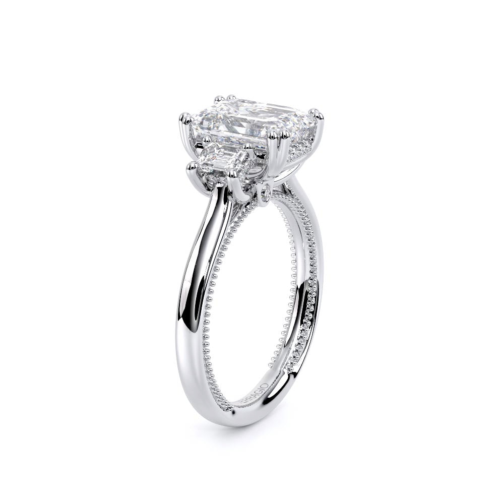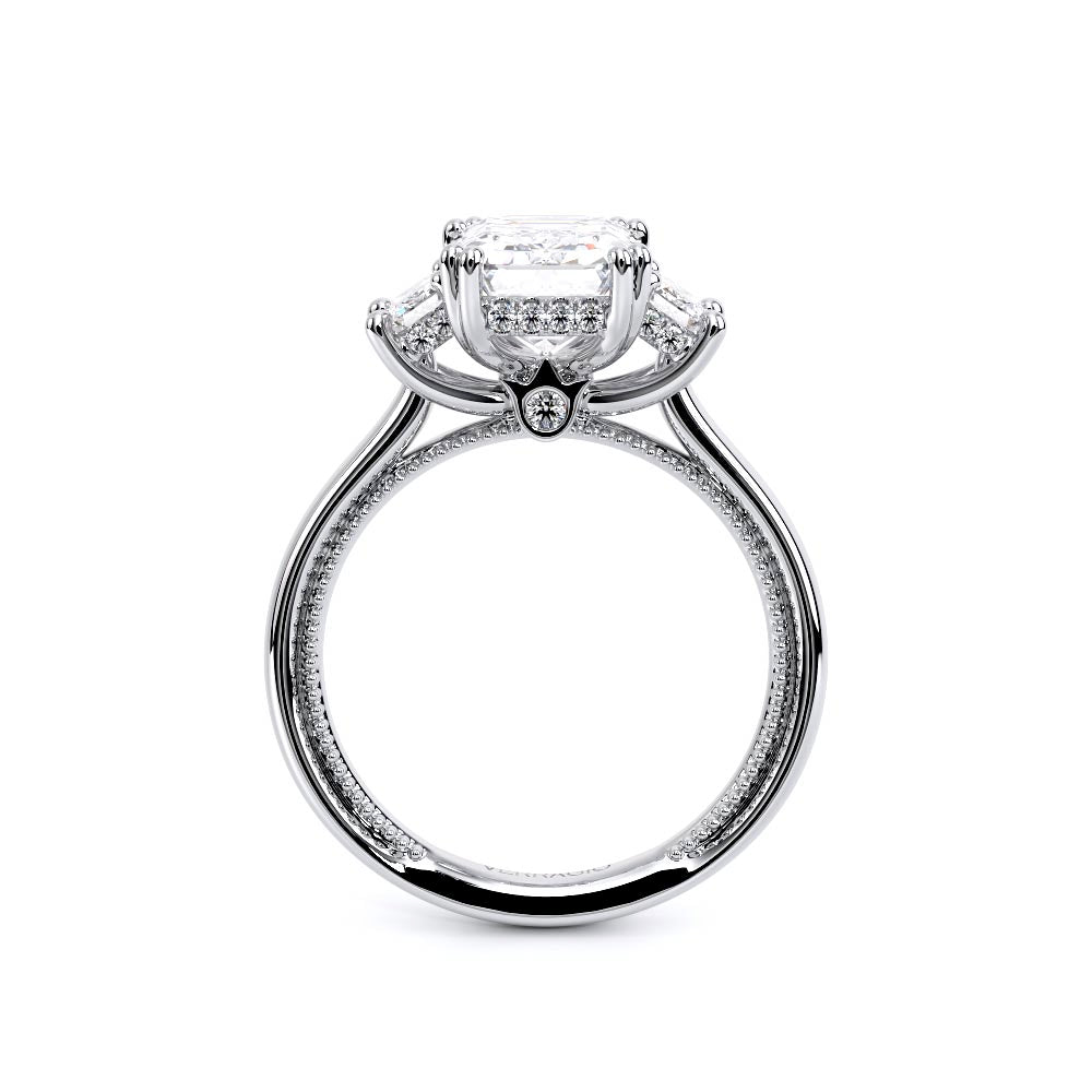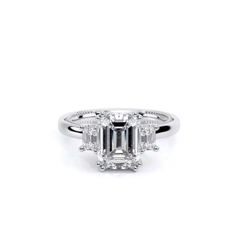 Renaissance-993EM-S features three dazzling emerald-cut side stones representing past, present, and future. The cathedral high-polish shank adds modern elegance with milgrain detailing and the signature Verragio crest make this ring a symbol of timeless love and commitment.