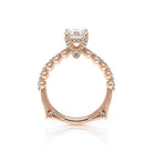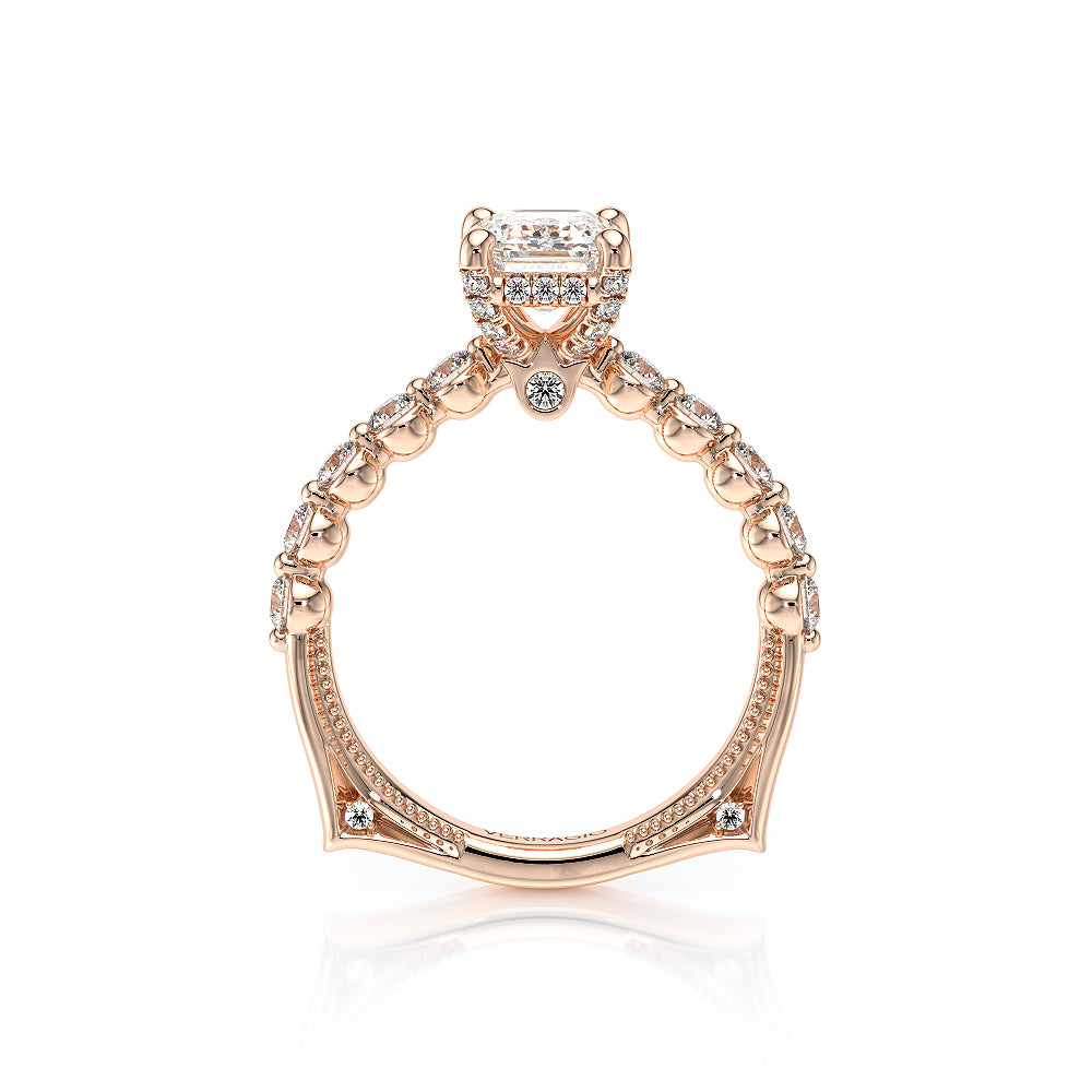 Set for an emerald center, the VNG-2201EM-2.4 features a euro-style shank at the bottom of the ring, elevated by two tiny diamond bezels. 2.4mm stones gracefully adorn the shank, set with a single shared prong for a timeless and elegant design.