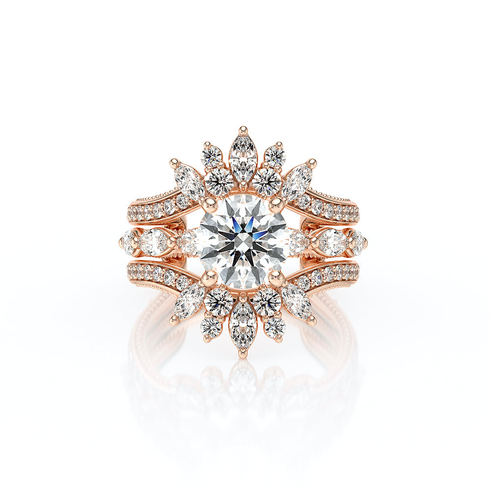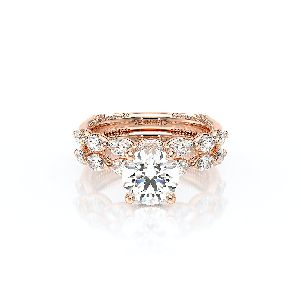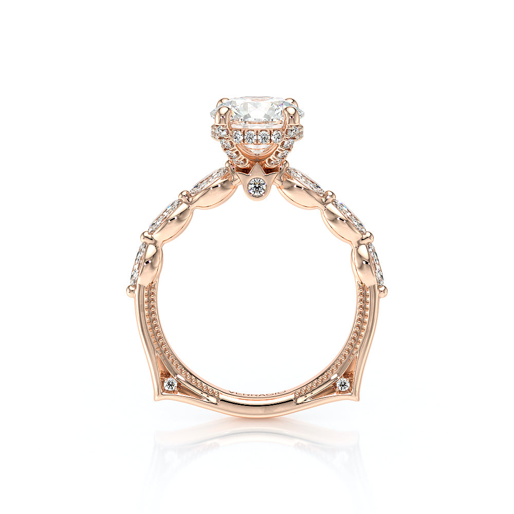 The VNG-2205R showcases three bold south-to-west facing marquise stones along the shank, complemented by Verragio beading and a diamond head for added sparkle.