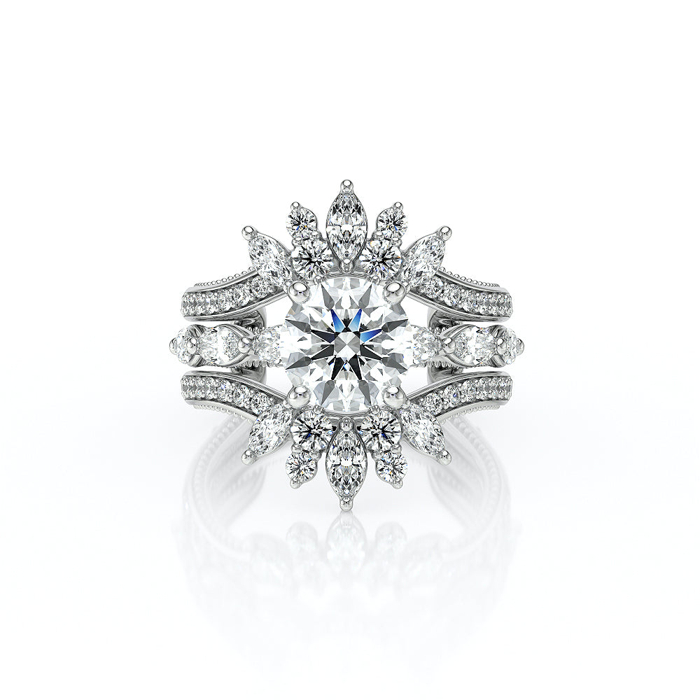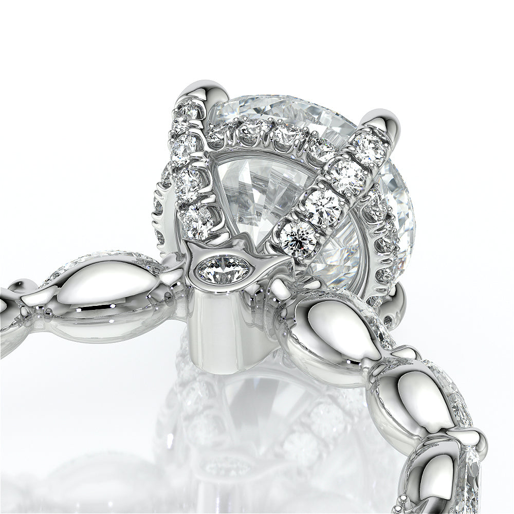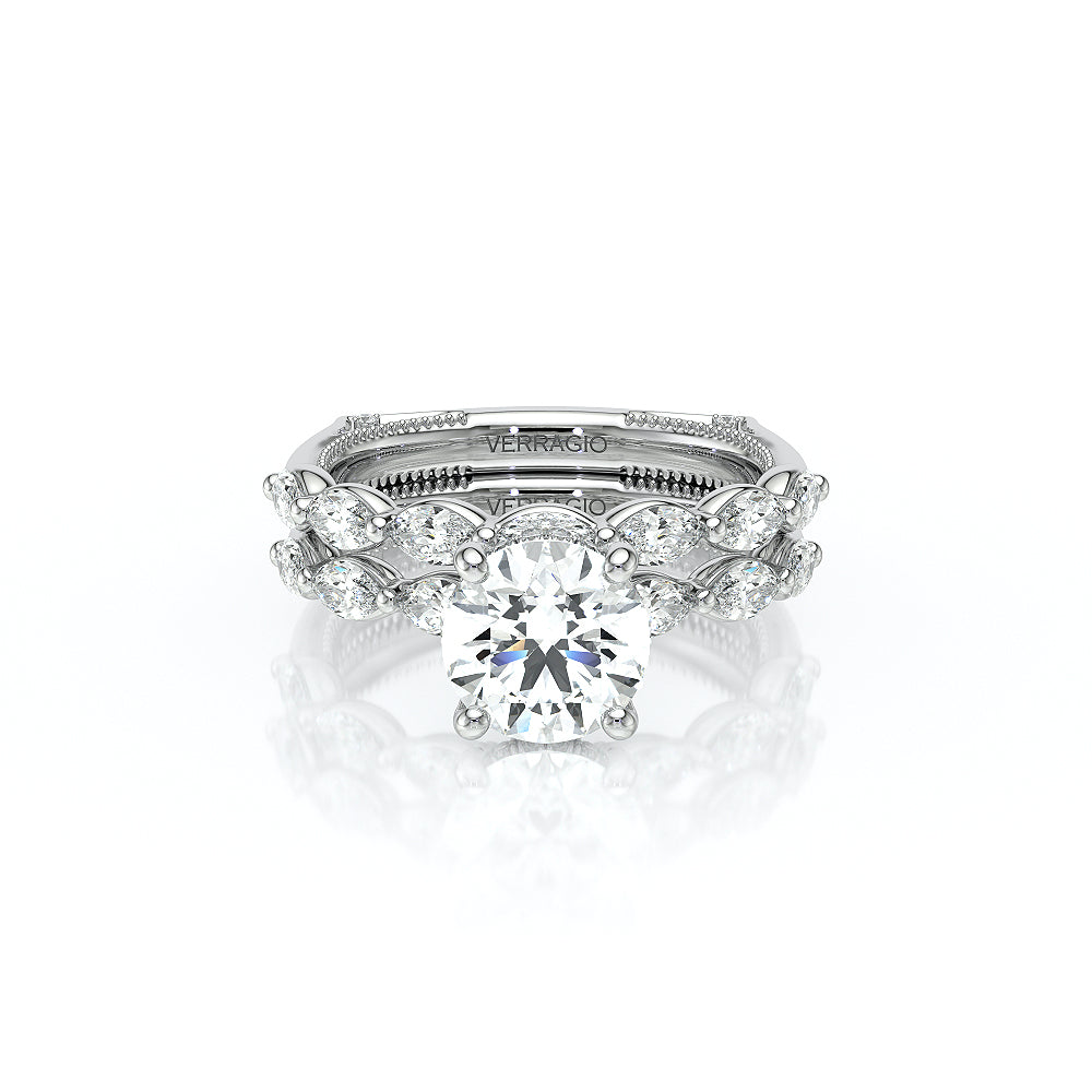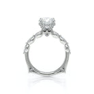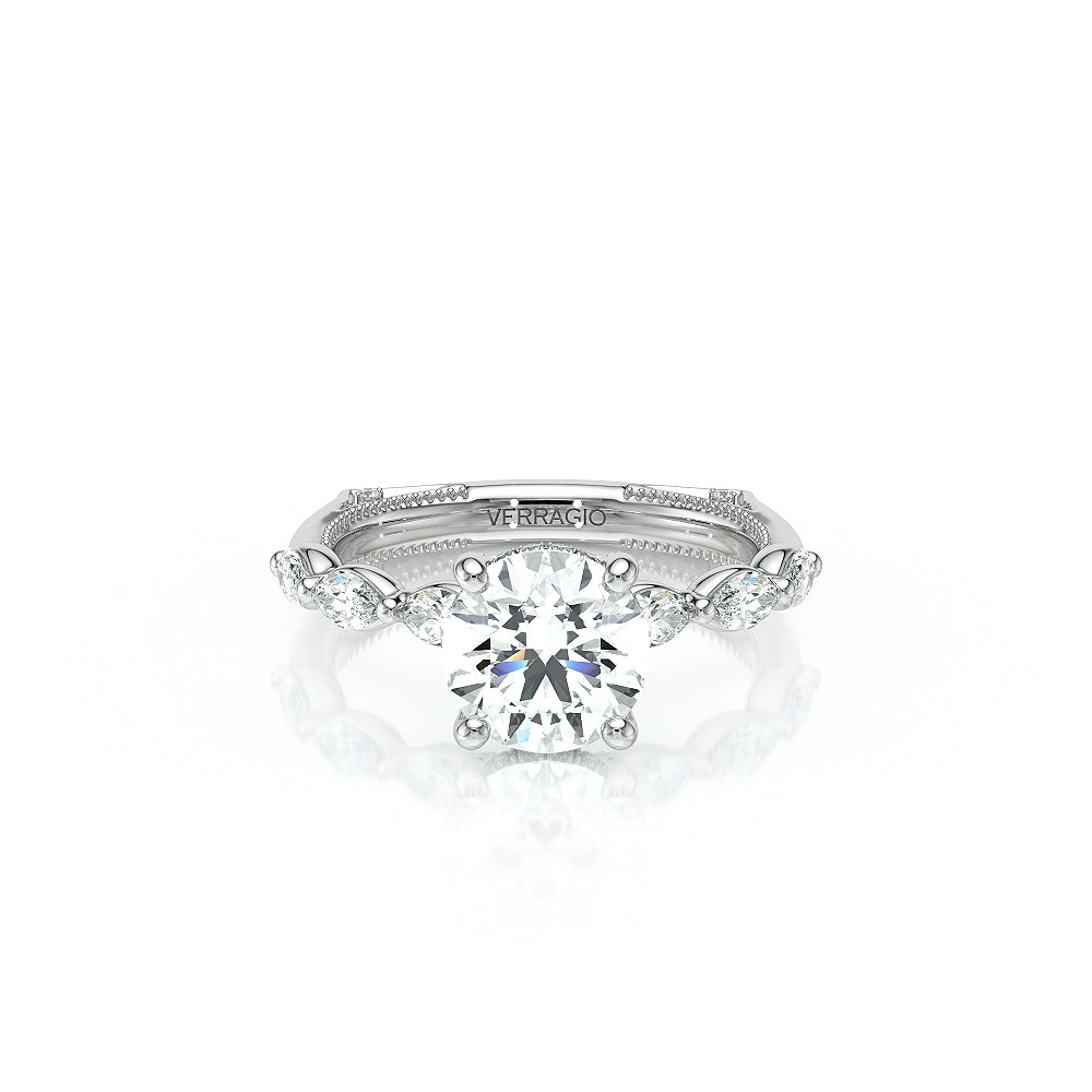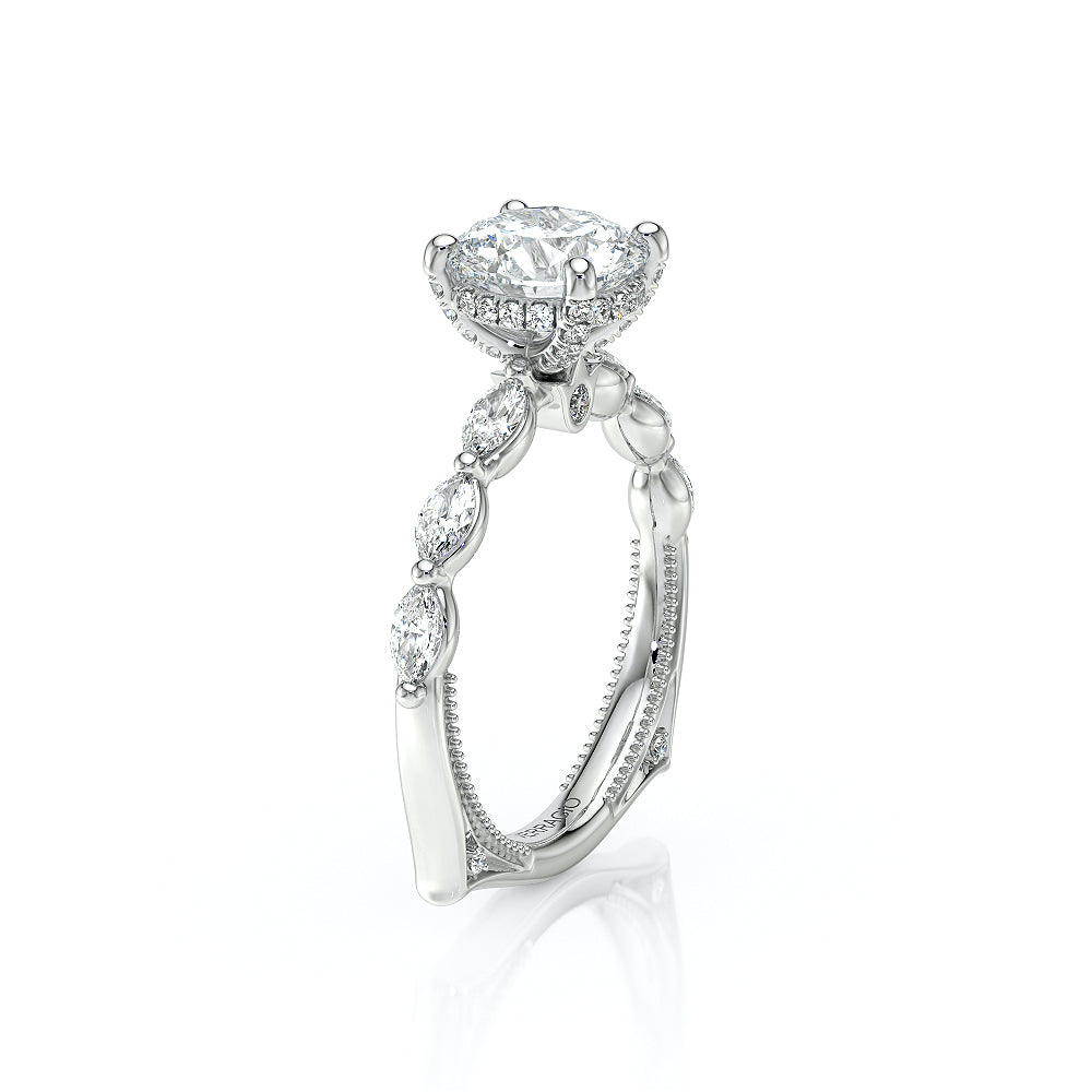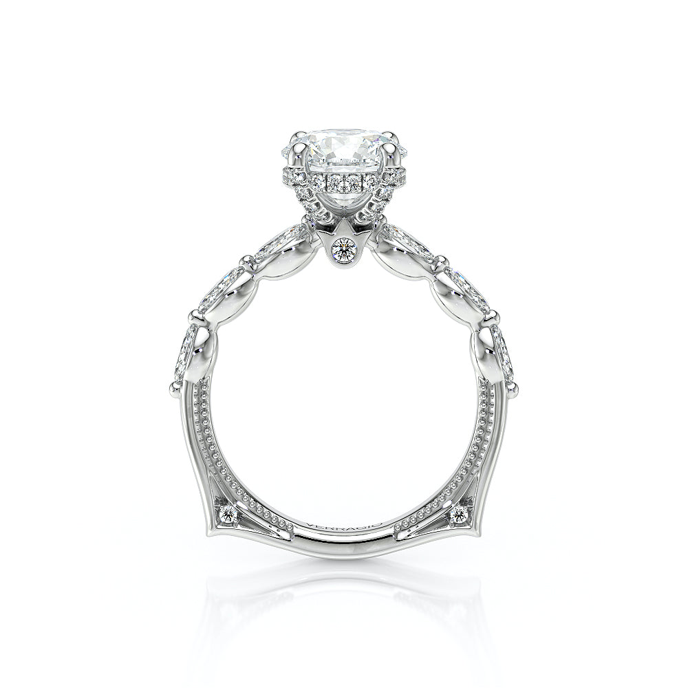 The VNG-2205R showcases three bold south-to-west facing marquise stones along the shank, complemented by Verragio beading and a diamond head for added sparkle.