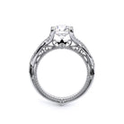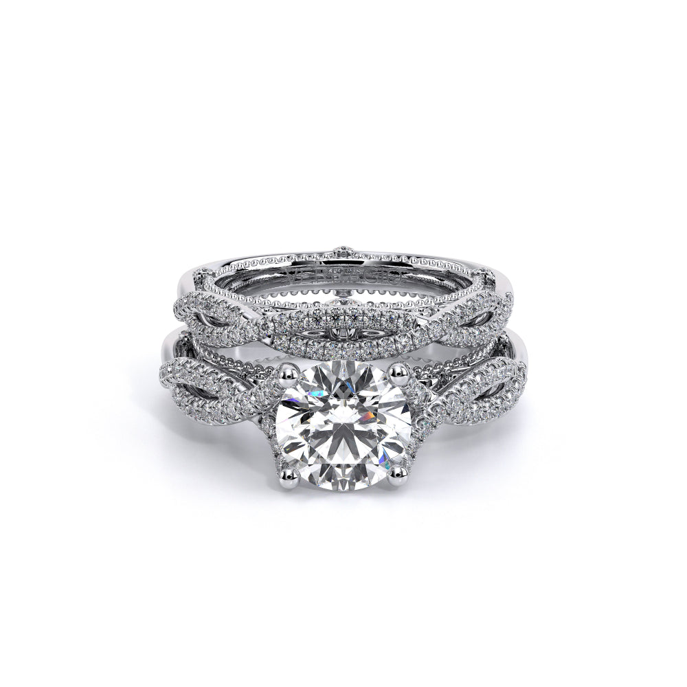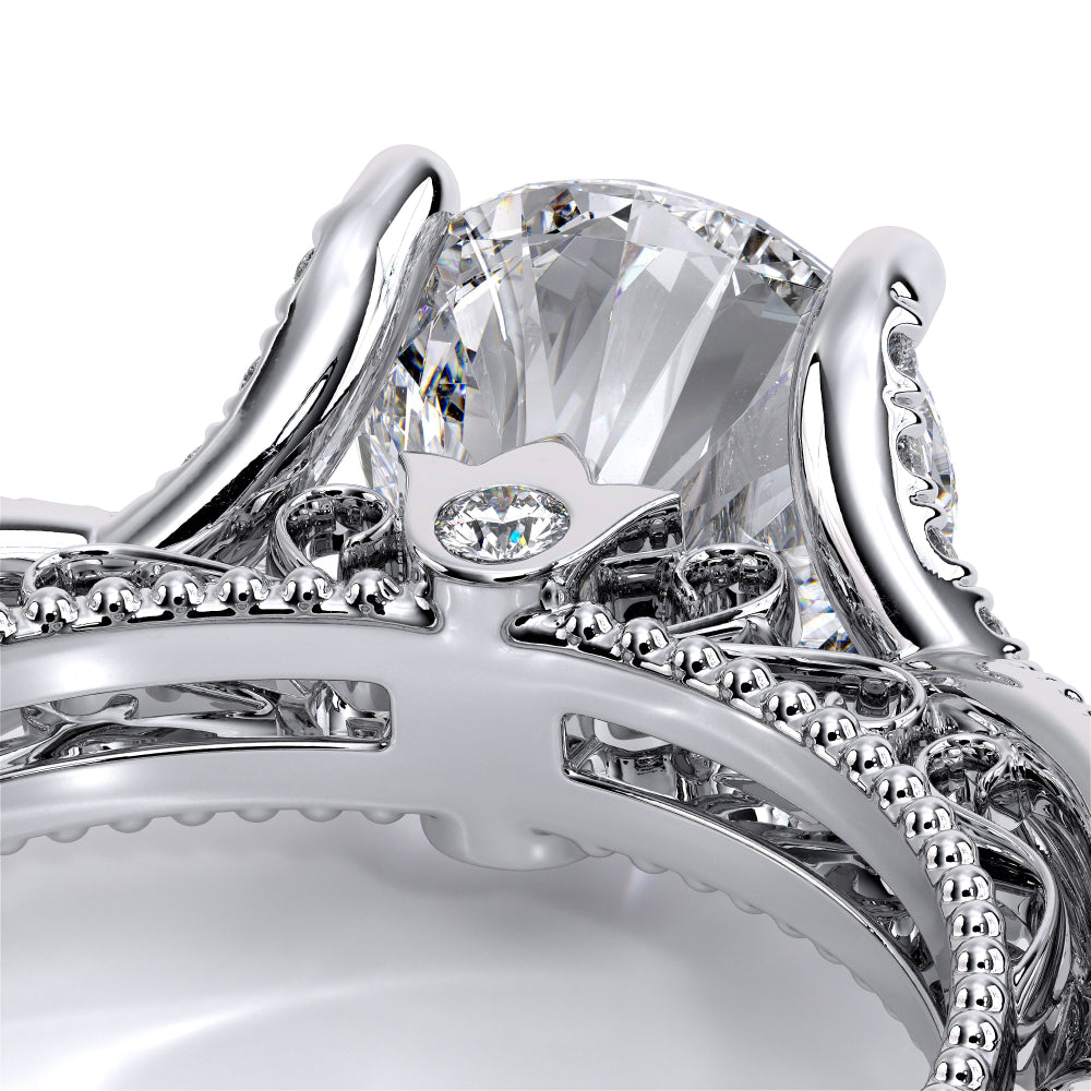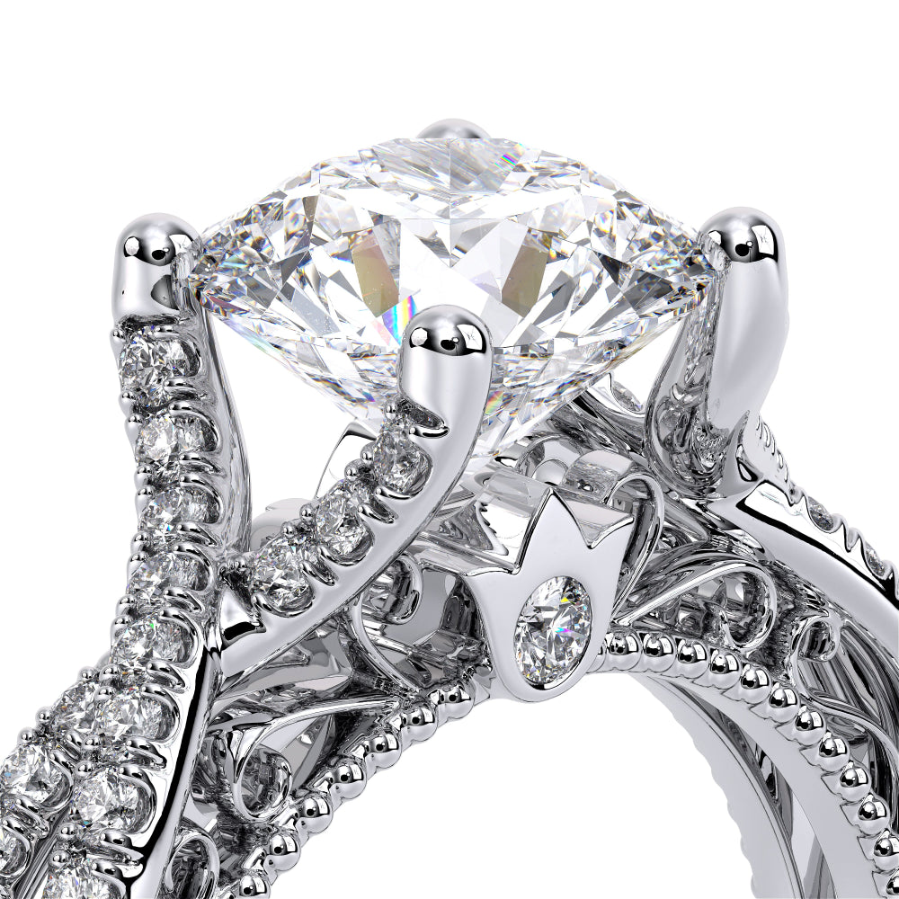VENETIAN-5003 engagement ring from the Venetian Collection, features round brilliant-cut diamonds pave set in a twisted shank, enhancing the center stone giving an illusion of a floating diamond. Our beautiful Venetian lace and Verragio signature beading completes this vintage piece.