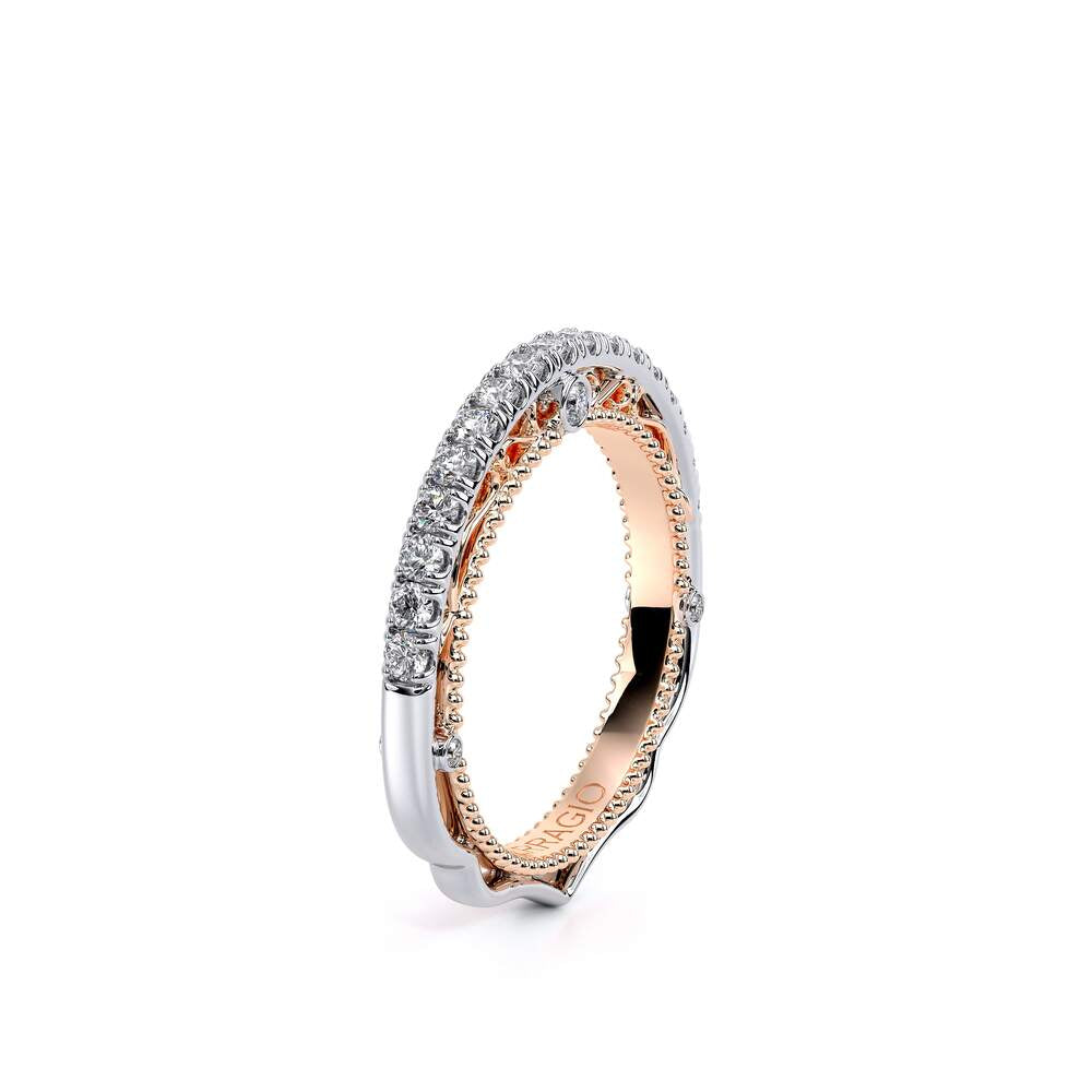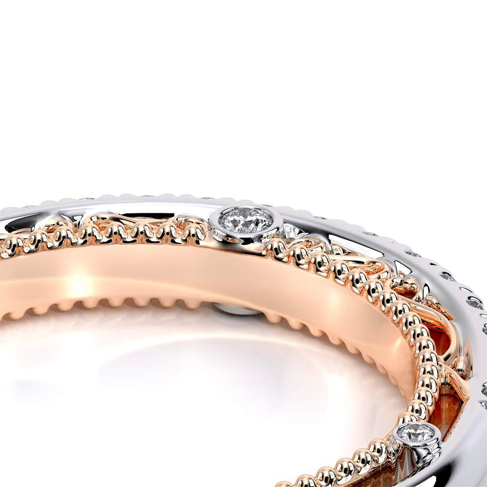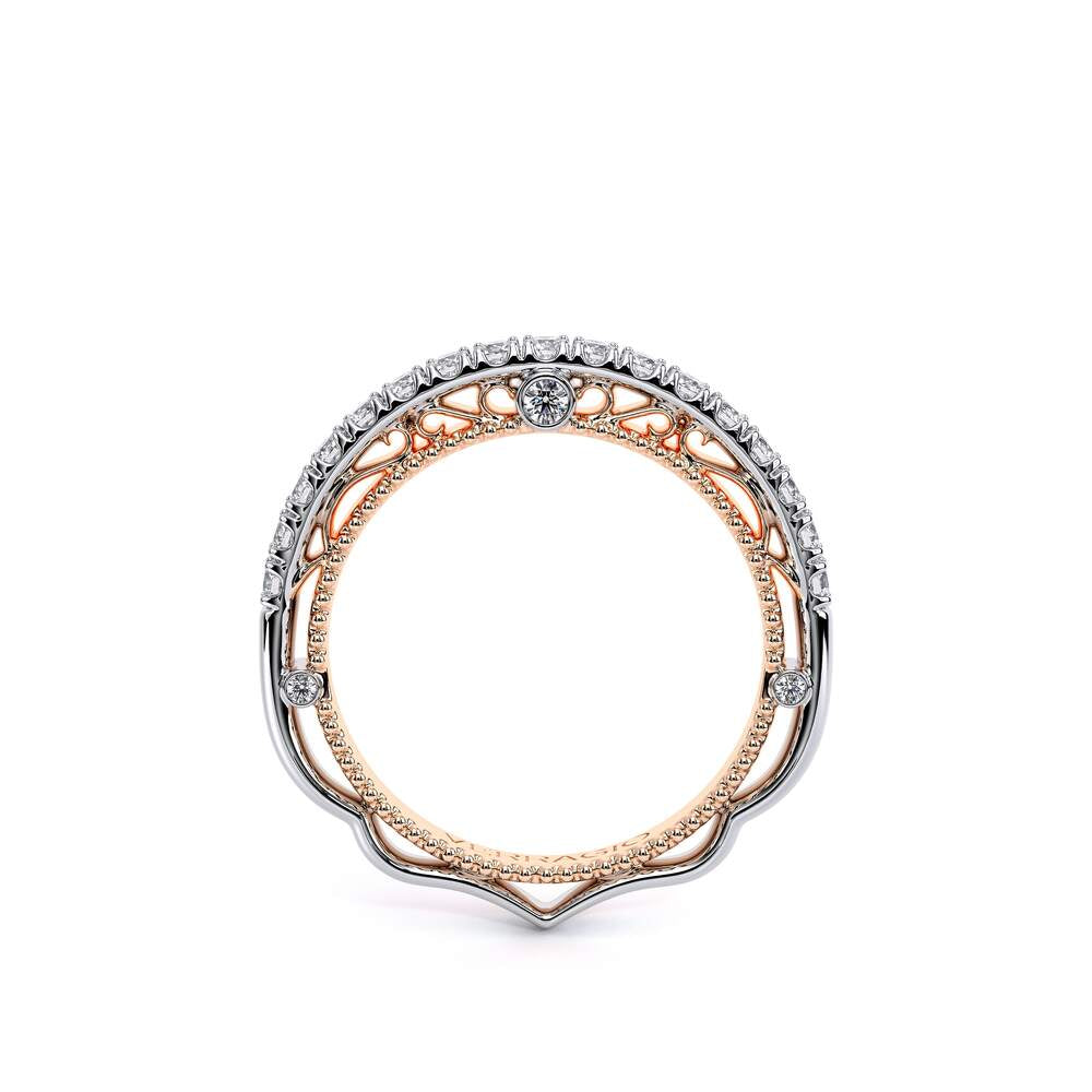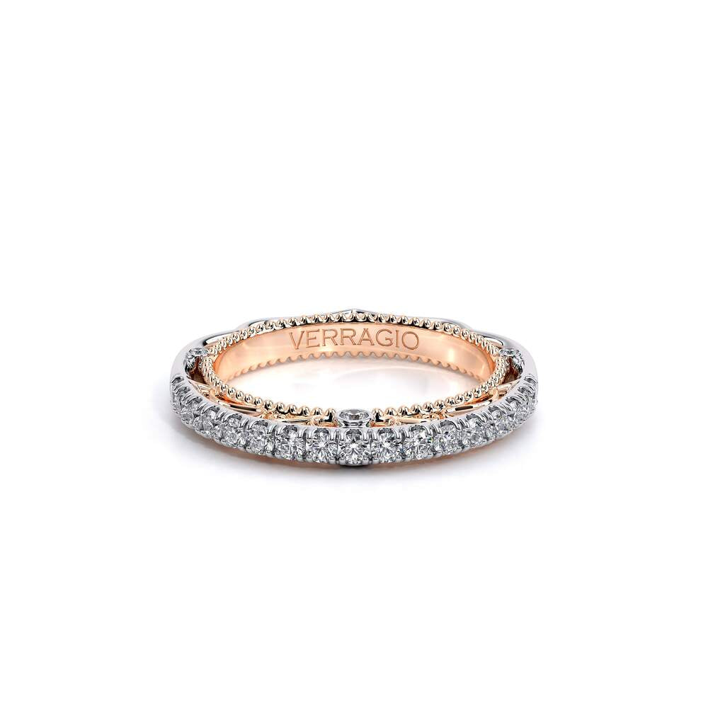 VENETIAN-5057W from the Venetian Collection, features a straight shank adorned with round brilliant diamonds. The inside profile showcases three bezel set round diamonds each side along with lace & signature beading to match with your engagement ring. Complete your Verragio look by customizing your bridal set today.