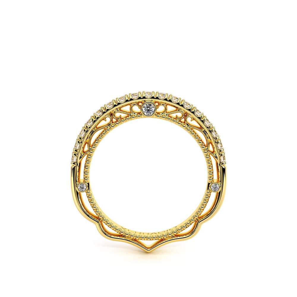 VENETIAN-5057W from the Venetian Collection, features a straight shank adorned with round brilliant diamonds. The inside profile showcases three bezel set round diamonds each side along with lace & signature beading to match with your engagement ring. Complete your Verragio look by customizing your bridal set today.
