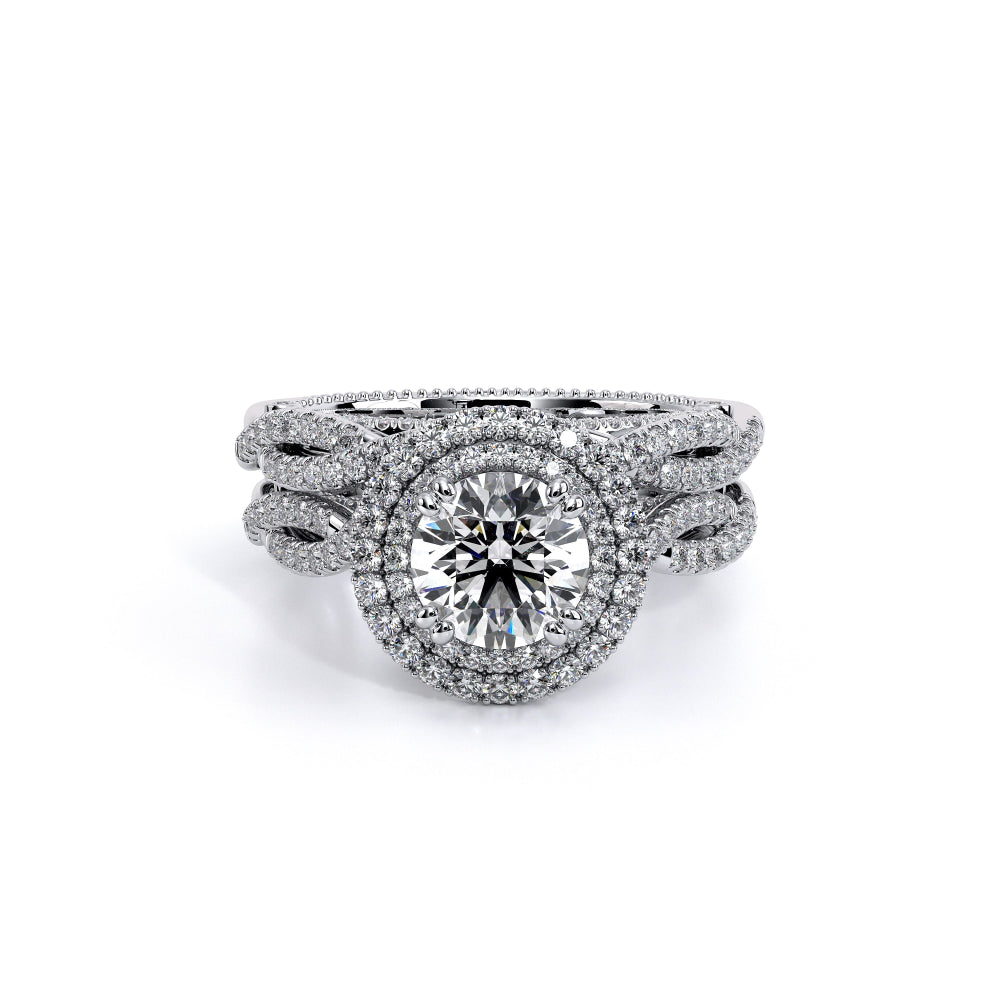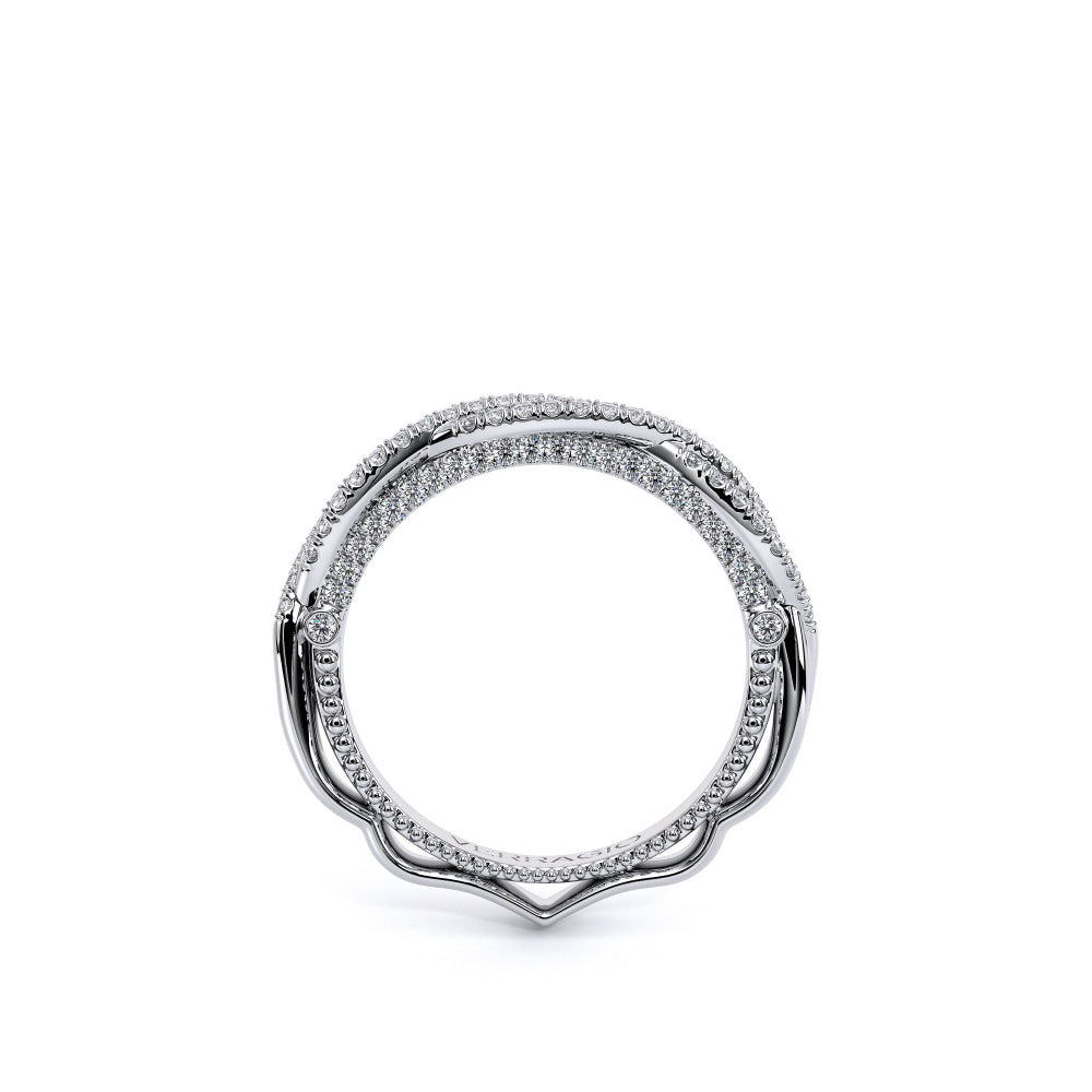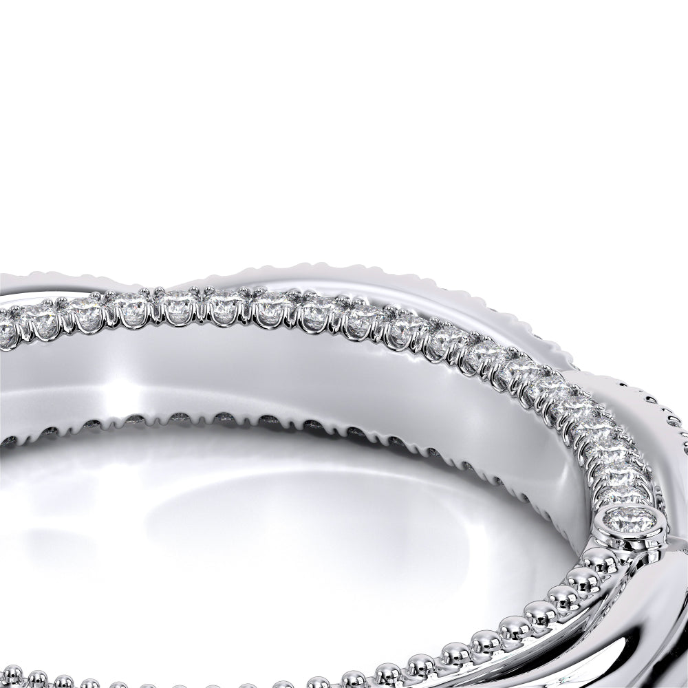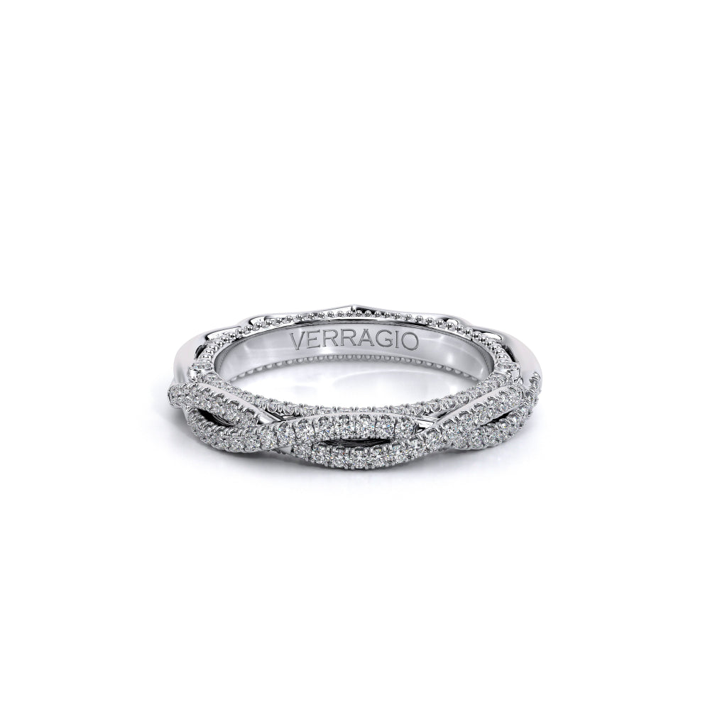VENETIAN-5066W from the Venetian Collection, features a twisted band encrusted with round brilliant diamonds. The inner profile showcases a beautiful diamond Riviera infused seamlessly with our signature beading. Compliment your Verragio engagement ring by choosing either a twisted or a straight band.