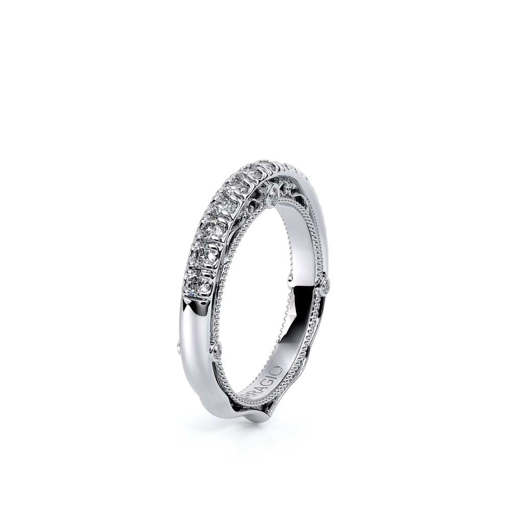 VENETIAN-5080W from the Venetian Collection, is a straight band featuring round brilliant diamonds. The inside profile showcases three bezels set round diamonds along with lace & signature beading. Complete your Verragio look by customizing your bridal set today.
