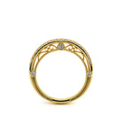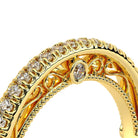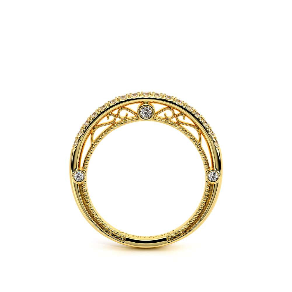 VENETIAN-5082W features a straight band adorned with round brilliant-cut diamonds. The inner profile showcases three bezels set round diamonds along with our signature beading and lace. Complete your Verragio look by customizing your bridal set today.