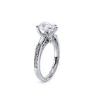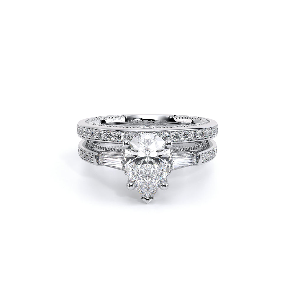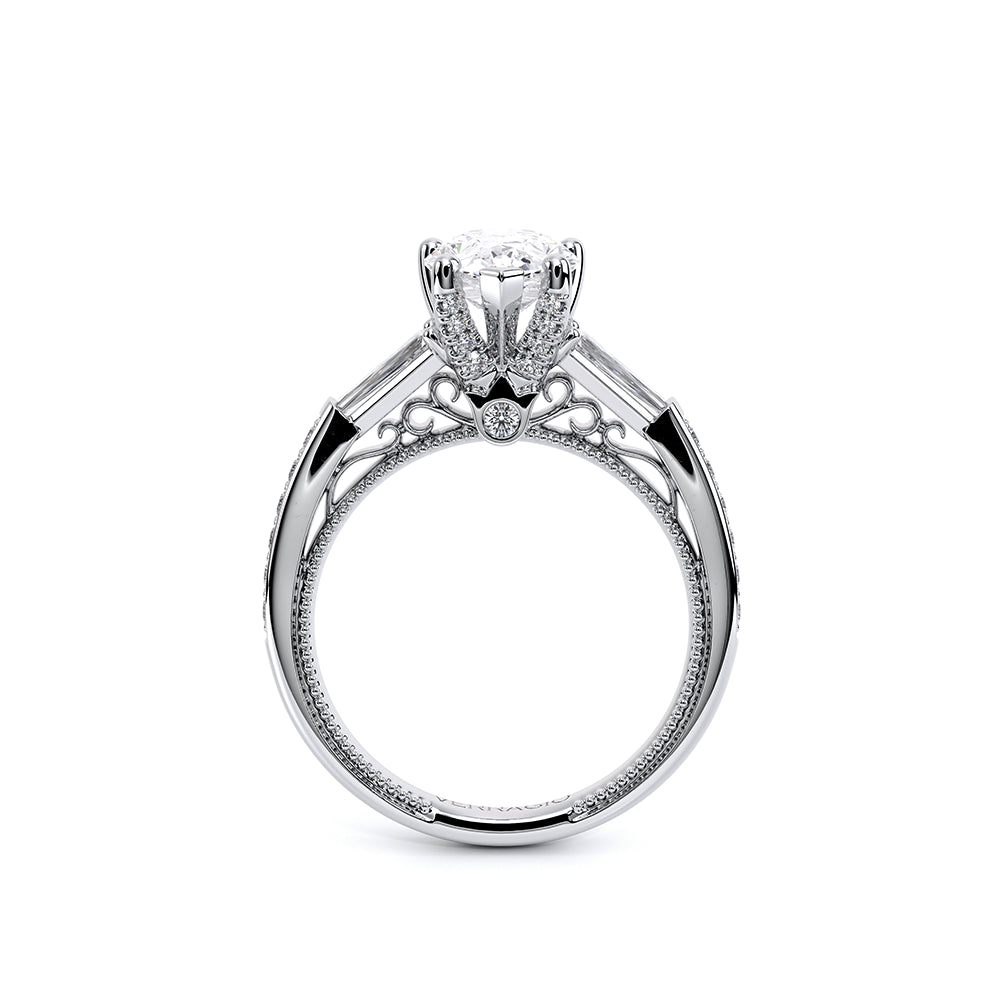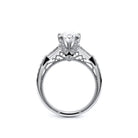 VENETIAN-5085PS is a three-stone diamond engagement ring adorned with meticulously set diamond prongs featuring two baguette diamonds seamlessly integrated on a straight diamond band. The inner profile showcases handcrafted lacework and our Verragio signature beading.