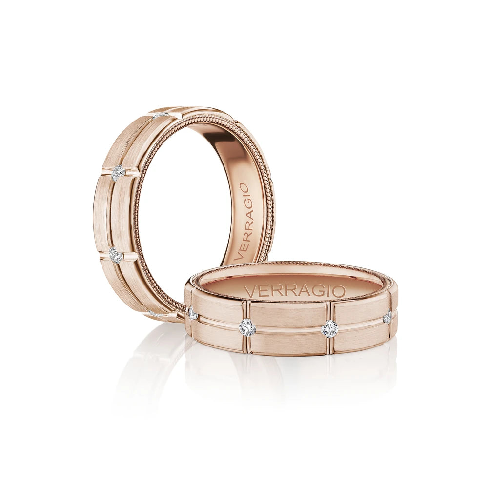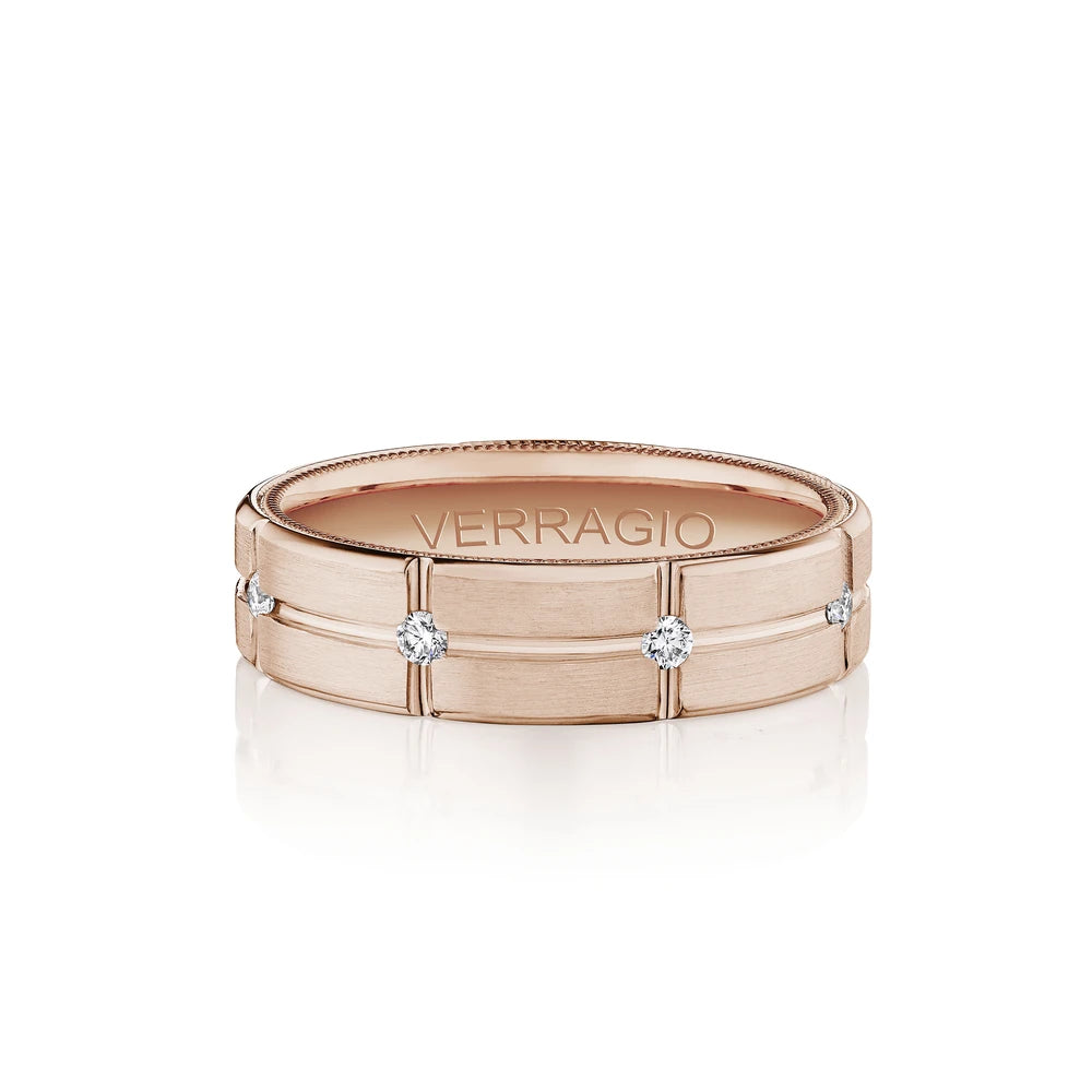 VWD-6921 is our sophisticated 6MM width diamond men's band with a matte finish. Running through the heart of the band are round brilliant-cuts within the singular etched grove, complimented by Verragio's rose gold signature beading.