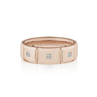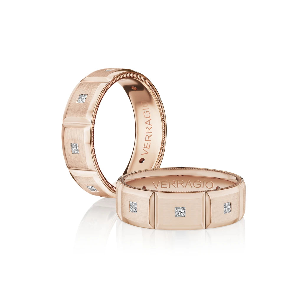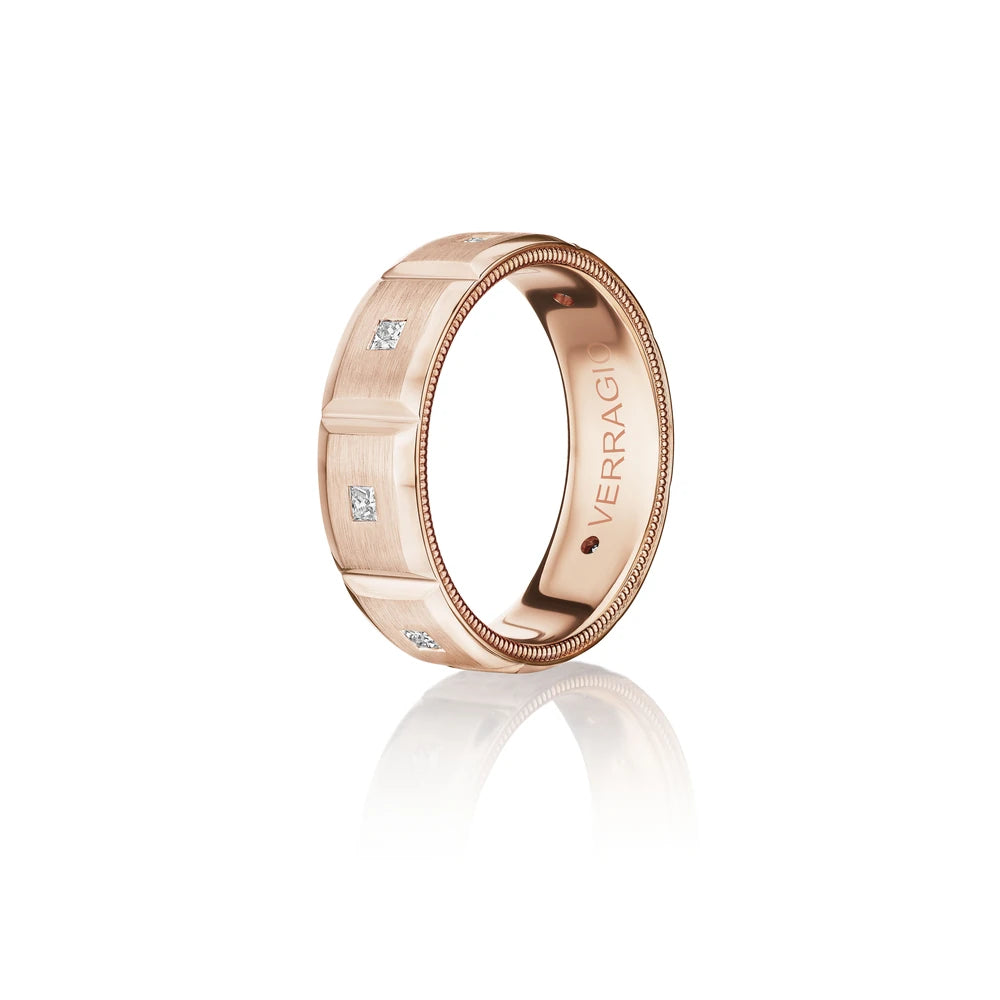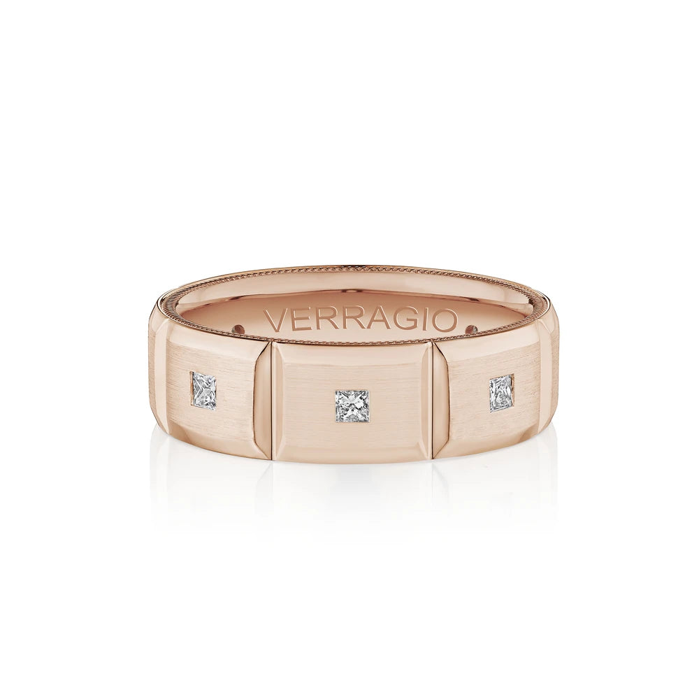 VWD-7913 is a modern matte finish Geometric 7MM width diamond men's band. Adorned with princess cuts throughout the band, the skillfully high polished edges are enhanced by Verragio's signature rose gold beading.