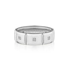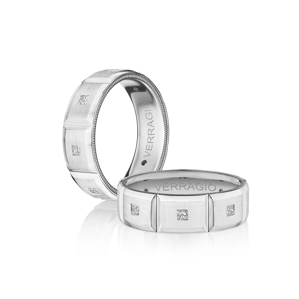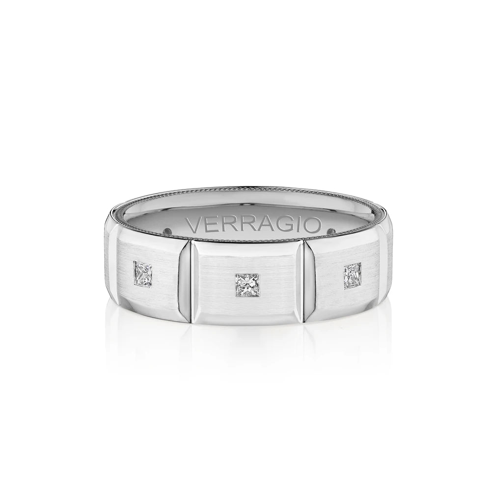 VWD-7913 is a modern matte finish Geometric 7MM width diamond men's band. Adorned with princess cuts throughout the band, the skillfully high polished edges are enhanced by Verragio's signature rose gold beading.