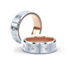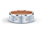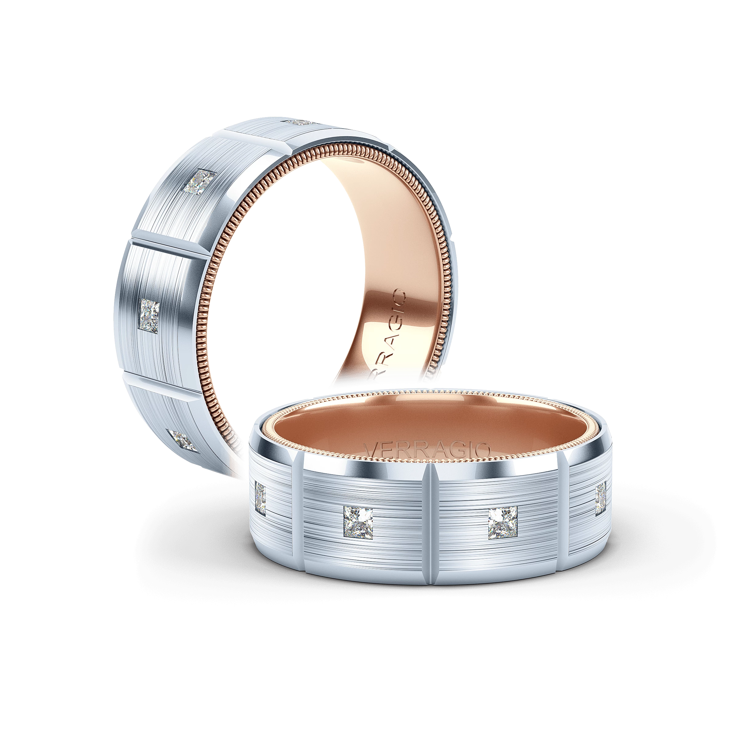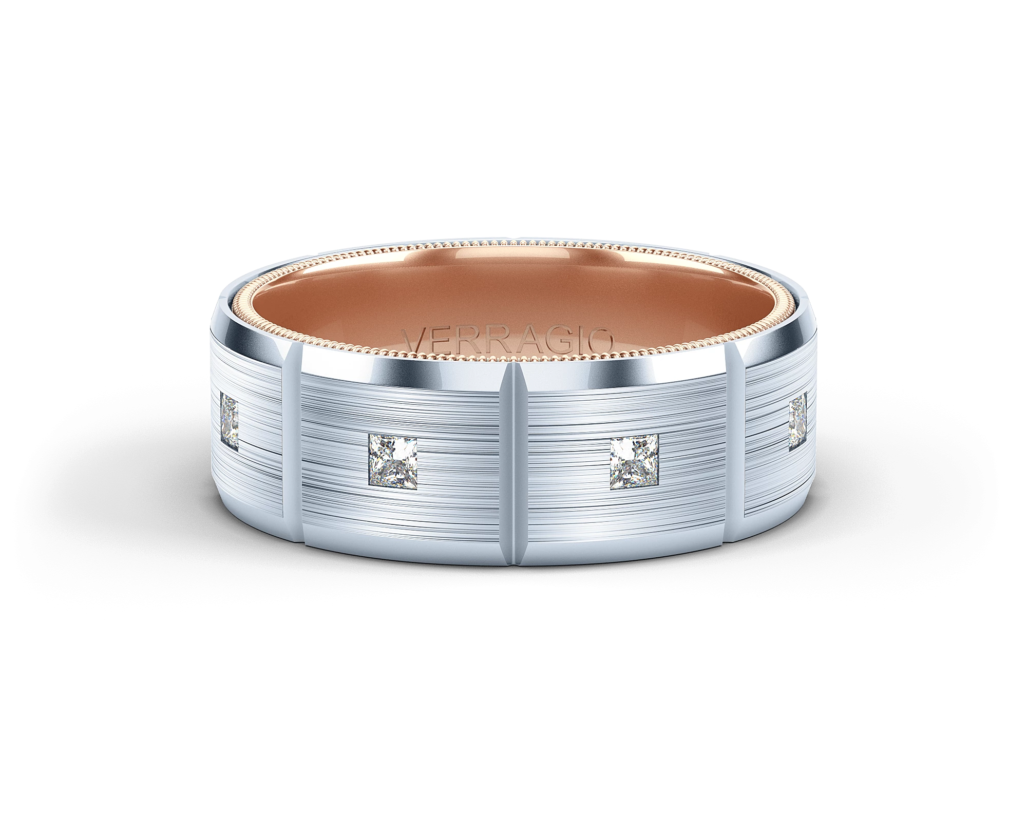 VWD-8906 is a modern matte finish Geometric 8MM width diamond men's band. Adorned with princess cut diamonds throughout the band, the skillfully high polished edges are enhanced by Verragio's signature rose gold beading.