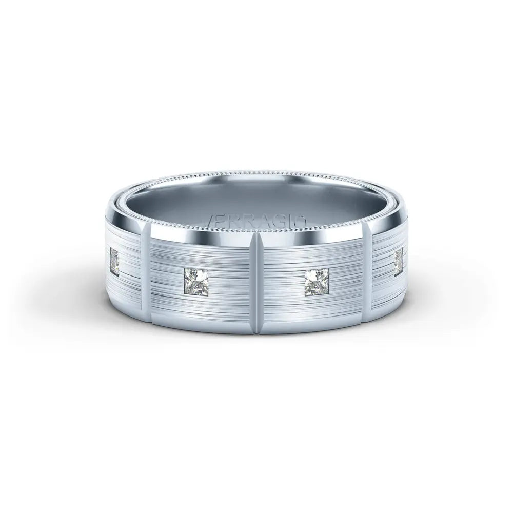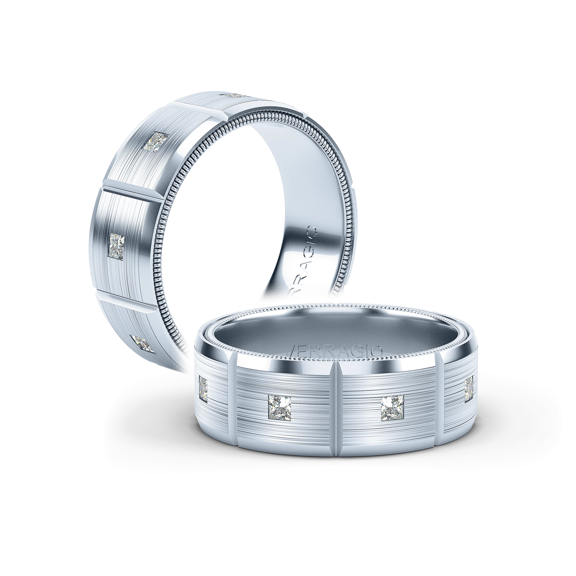 VWD-8906 is a modern matte finish Geometric 8MM width diamond men's band. Adorned with princess cut diamonds throughout the band, the skillfully high polished edges are enhanced by Verragio's signature rose gold beading.