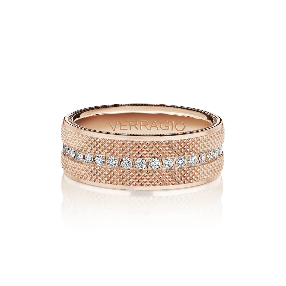 VWD-8915 features a textured embellished band with a seamless string of meticulously set diamonds, offering a fashionable cutting-edge.