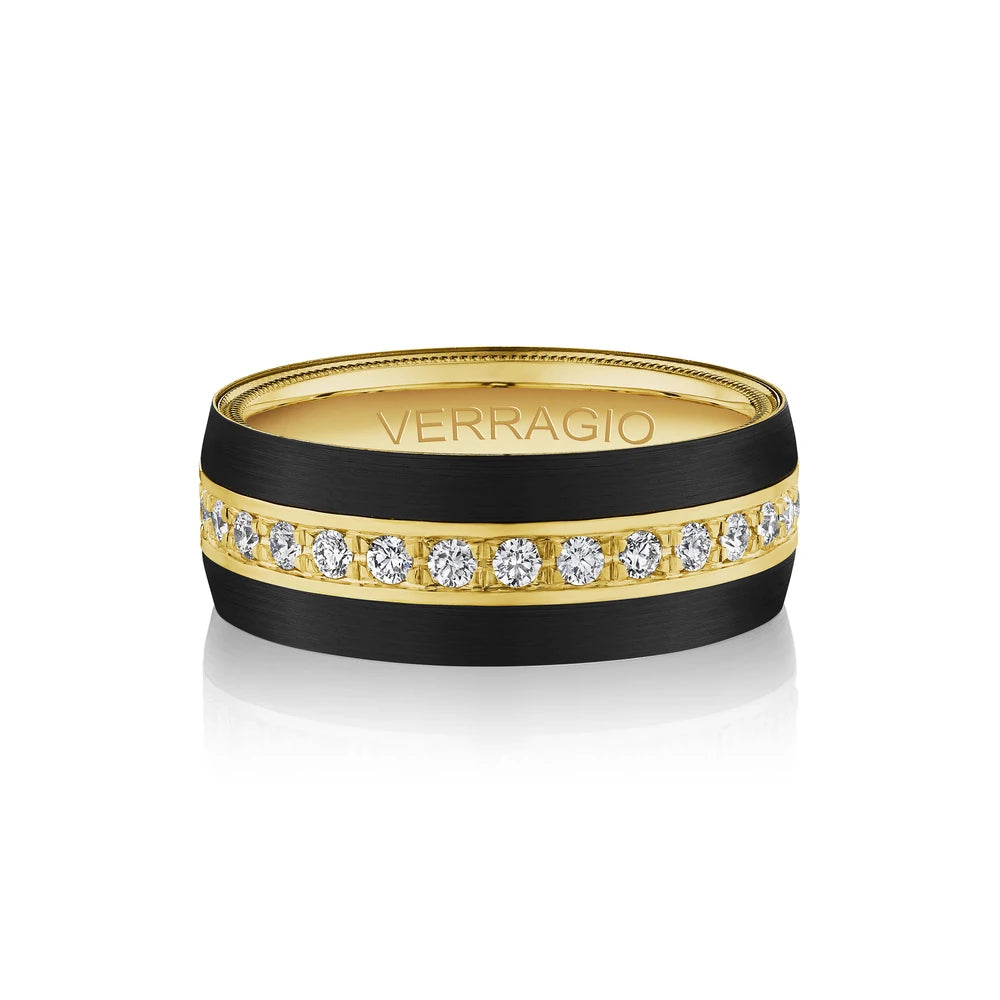 Durable titanium with dazzling diamonds. Our newest design sets a channel of diamonds in rose yellow or white gold amid twin stripes of black or gray titanium. Verragio' Signature beading completes this exclusive style with signature panache while the 8mm width fits comfortably for everyday wear. Available in 14KT and Platinum.