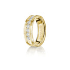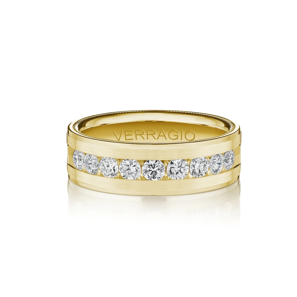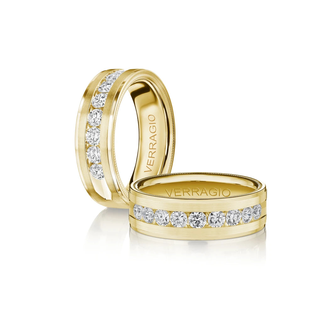 The VWRD-7704-3 features a distinctive 7mm band with a step-cut center that elegantly houses a channel-set diamond line of 3.00mm stones. The design is further enhanced by black enamel along the edges and meticulous beading, offering a striking contrast and a sophisticated, detailed finish. This band is perfect for those who value precision and a contemporary twist on classic elegance.