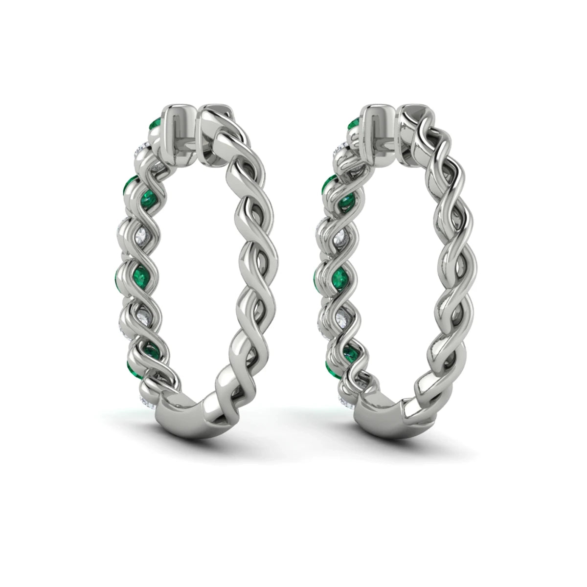 Diamond and Emerald Twist Hoop Earrings White Gold