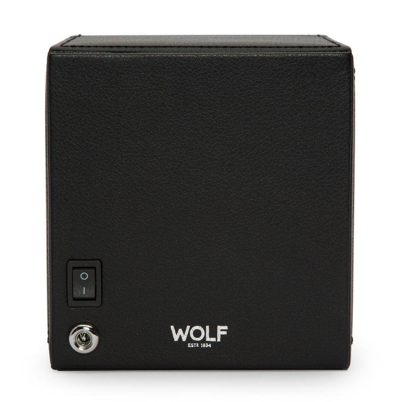 Young, smart and uncomplicated, the cub takes care of your watch with ease. Six sides perfectly proportioned to encase your timepiece safely and precisely. Never miss a beat in your busy life. Features black vegan leather, chrome finished hardware and single winding module. Features: Patented Innovation - Every WOLF winder counts the precise number of rotations. All other winders estimate the number of rotations; Lock-in dynamic cuff: Patented lock-in dynamic cuff 'locks' your timepiece into the rotator drum for a secure fit. Low density foam to accommodate all wrist sizes without putting pressure on your bracelet; Rotation: 10 second start delay, 900 TPD (Turns Per Day), patented rotation programs - Intermittent rotation with pause and sleep phases pre-programmed; Directional Settings: Bi-directional; Battery Option: Option to run the unit on AC power (universal adapter included) or AA batteries - alkaline or lithium (lithium batteries will last twice as long as alkaline batteries). Batteries not included;