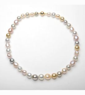 This necklace features alternating lustrous multicolour South Sea and Freshwater pearls of exceptional quality and size, ranging from 8mm to 12mm, finished with an elegant diamond clasp set in 18k gold. The unique colour of the pearls is natural, making this necklace the perfect choice for the woman who is looking for something truly unique.