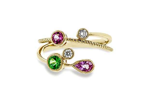 Use designs with vibrant colors from various jewels to make your ring stack even more eye-catching. To make a stunning stack, combine gemstone rings with plain metal forms or add stackable diamond bands to the mix.