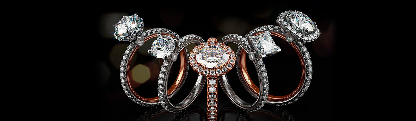 Women's engagement rings with bands that fit any central diamond, regardless of size or cut, in halo, solitaire, three-stone, or pavé settings are available. Verragio rings are also made-to-order, allowing the bride and groom to wear them with confidence.
