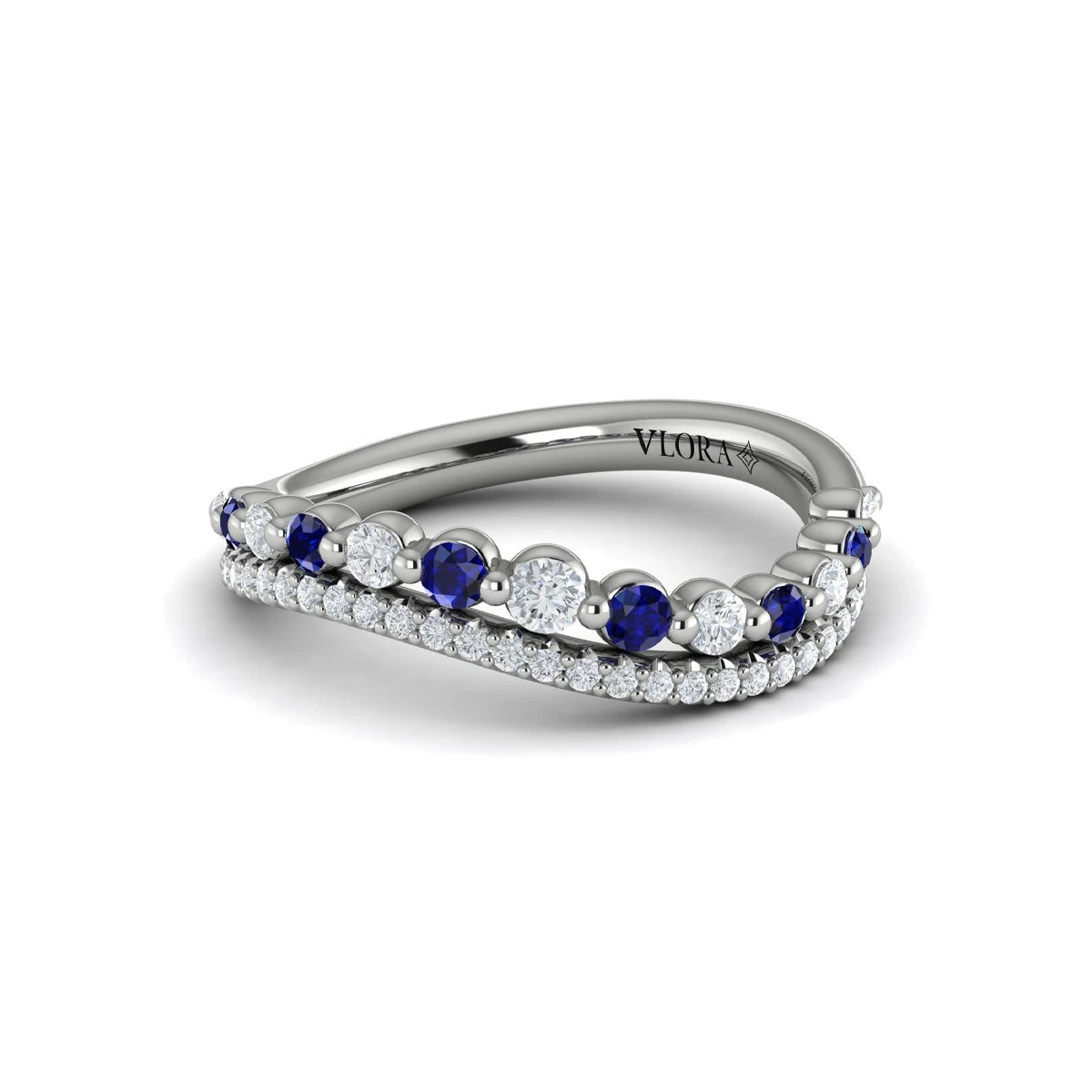 Diamond and Blue Sapphire Two Row Curved Ring White Gold