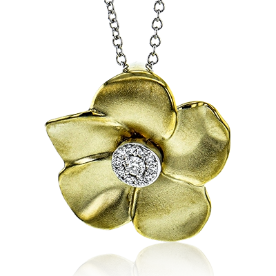 A Lustrous yellow gold flower pendant with 0.07 ct.white diam on 18" white gold chain