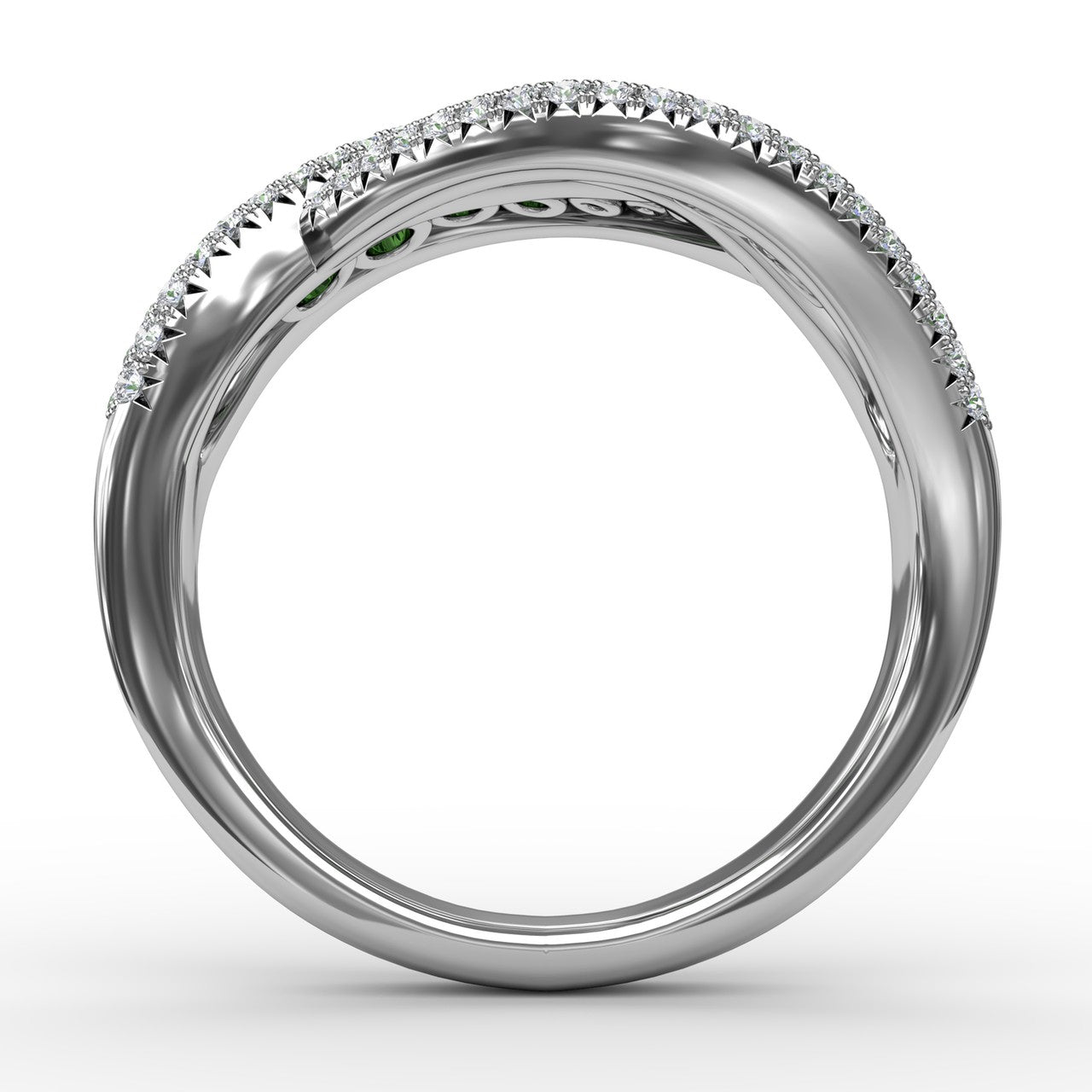 This intertwining ring features two rows of pave diamonds and one row of glissening emeralds. This ring comes in a variety of material types like 14k white gold, yellow gold, rose gold and can be customized. Fana gemstone fashion rings are perfect for that special woman in your life.