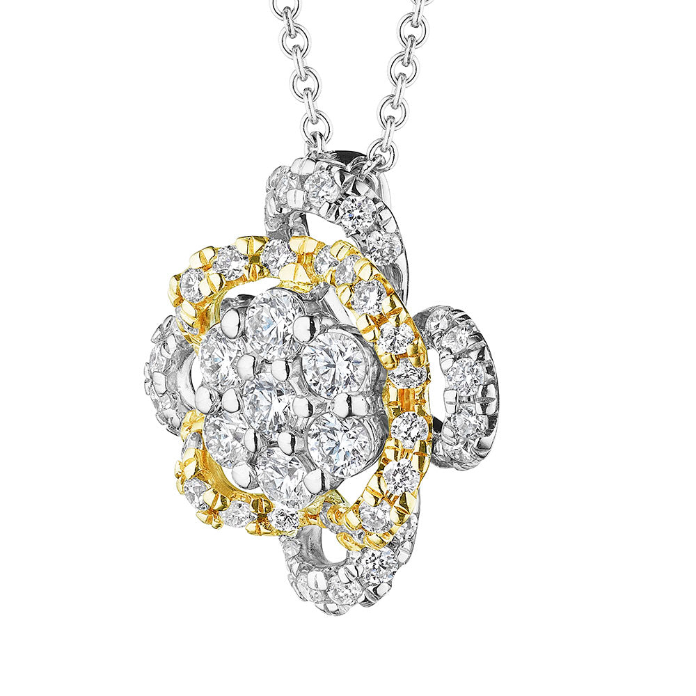 J-0150501-XP 18K white and yellow gold diamond floret halo pendant with 0.68ctw diamonds on 18" chain adjustable to 16".