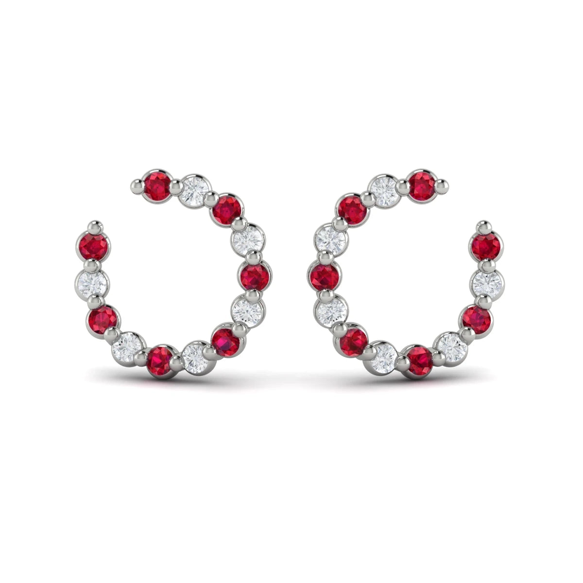 Forward-facing Diamond and Ruby Open Hoop Earrings White Gold