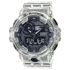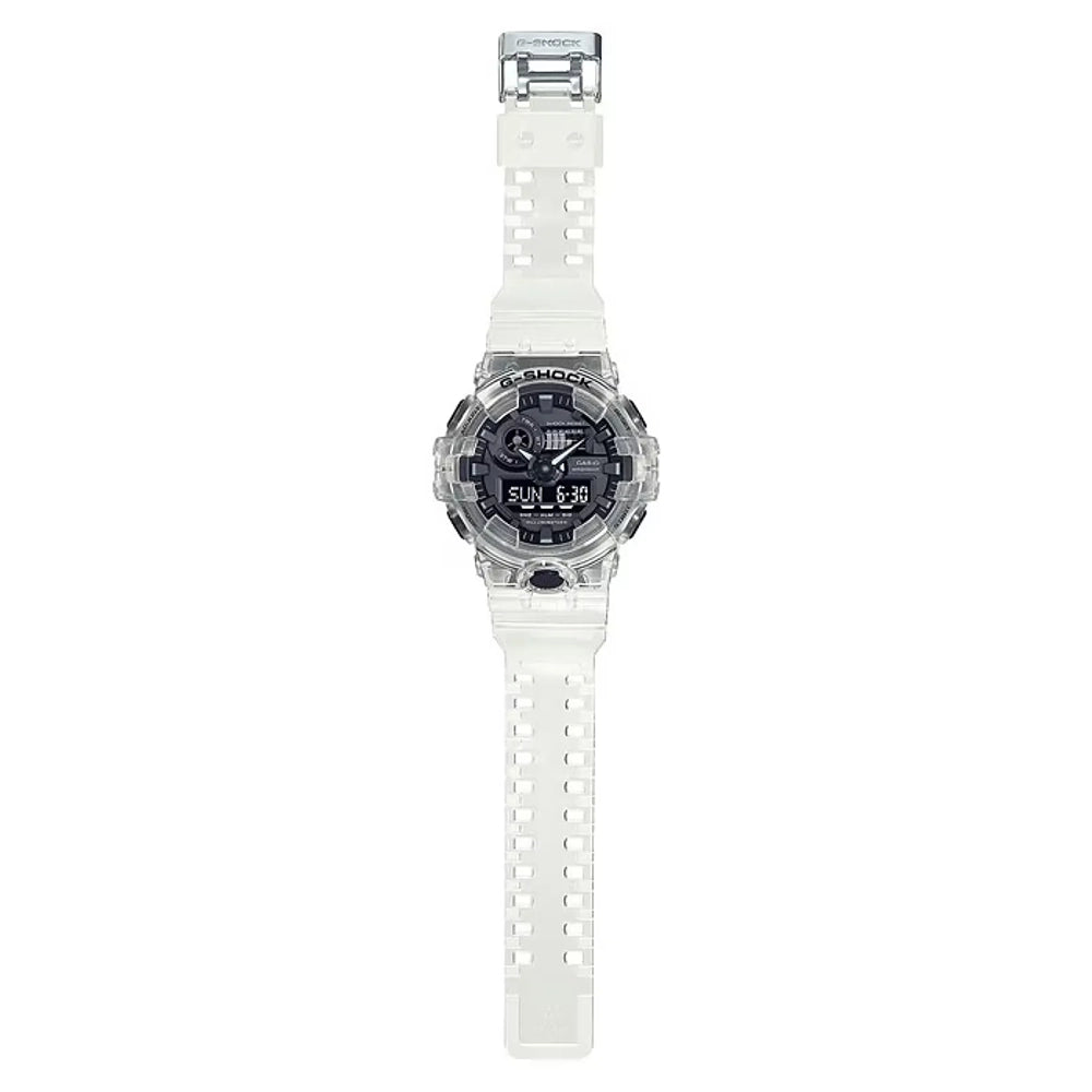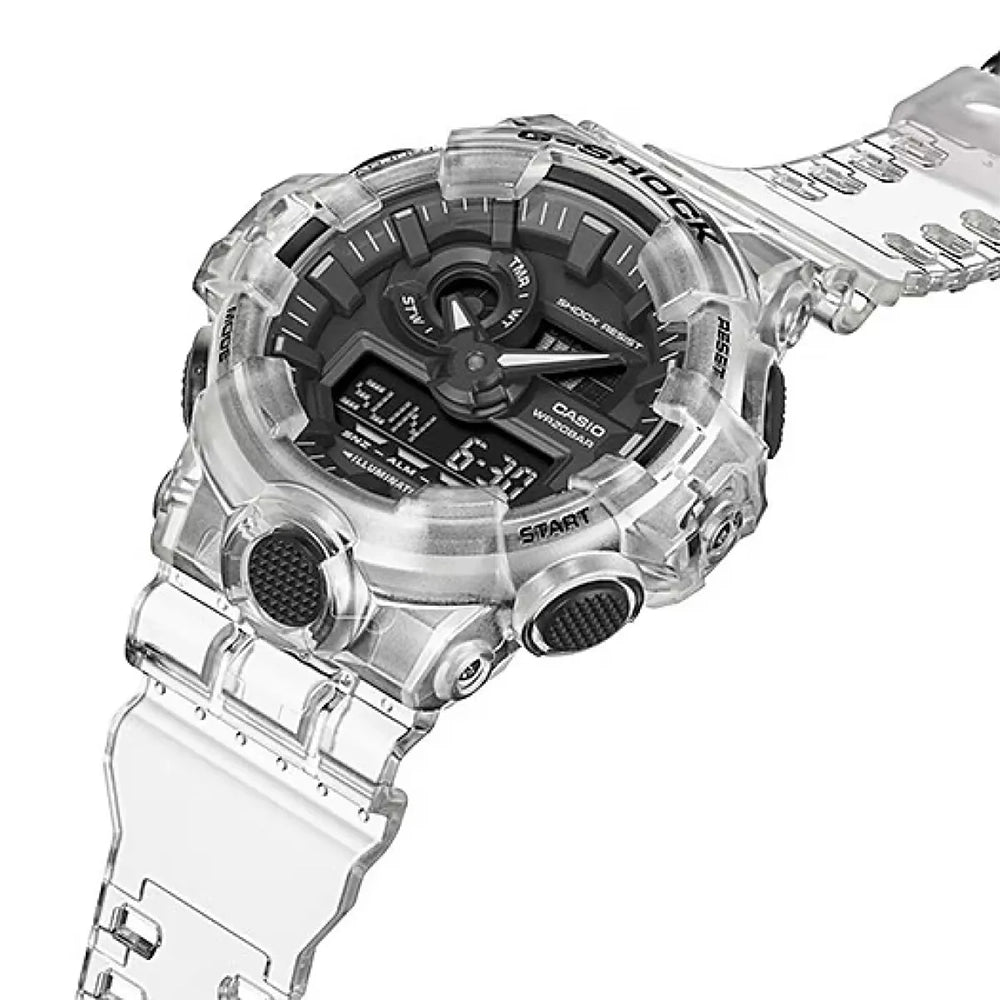 From G-SHOCK, the toughness watches that are ever evolving in an endless pursuit of strength, the skeleton series models are made from translucent resin parts. The coloring is clear with a white base. Based on the dynamic 3D-face design of the GA-700, this skeleton series model features chic coloring making it suitable as a fashion item.