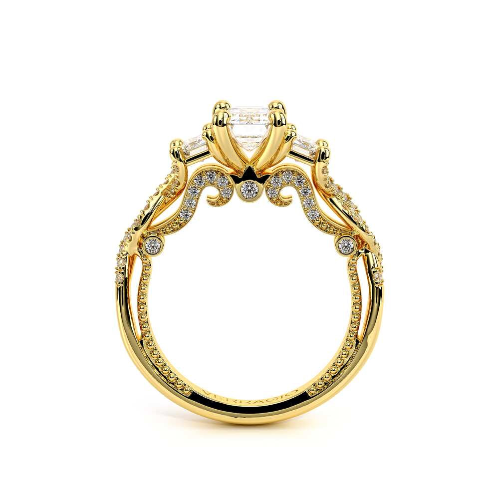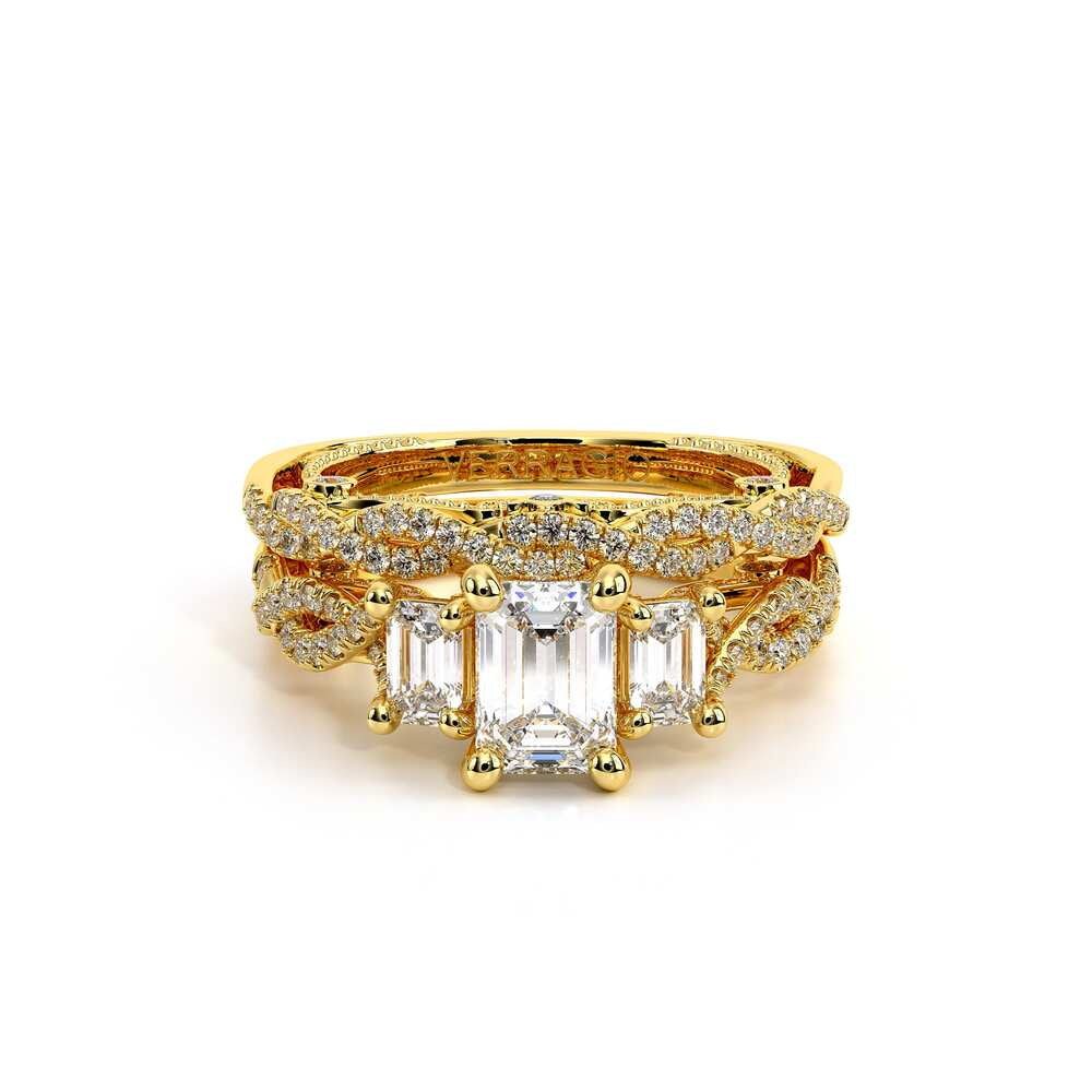 INSIGNIA-7074EM Three stone diamond engagement ring adorned with Verragio's signature beading, pave set brilliant-cut diamonds on Insignia's handcrafted scrollwork and twisted band. Refined to enhance a Emerald diamond center.
