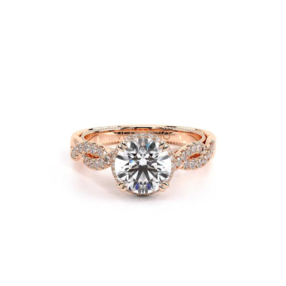 INSIGNIA-7099R Diamond engagement ring featuring Verragio's handcrafted stardust halo adorned with meticulously set round brilliant-cut diamonds atop a twisted band. Accompanying diamond Insignia scrollwork refined with Verragio's timeless signature crest and beading.