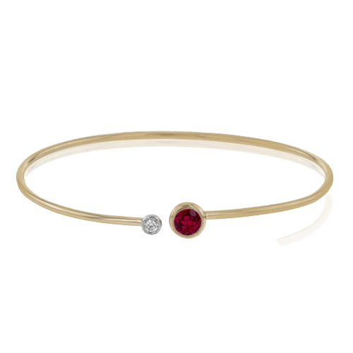 This understated rose gold bangle features a subtle .08 ctw white diamond accent opposite a stunning .73 ctw ruby. Perfect for stacking.