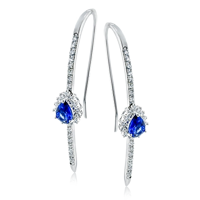 These distinctively modern linear earrings feature a splash of blue with pear shaped sapphires in their midst.