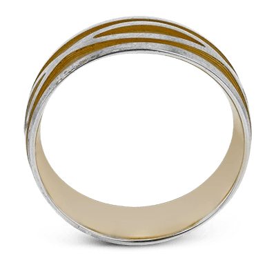 This striking men's two-tone wedding band presents an intricate entwined infinity design in white gold set against a rose gold background.