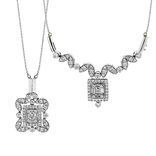 This white gold necklace's innovative folding design lets you decide how best to show off .49 ctw of round white diamonds and .15 ctw of baguette shaped diamonds