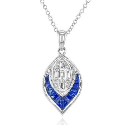 This unique pendant contains a section of custom cut blue sapphires that fit together perfectly, as well as a mosaic of diamonds.