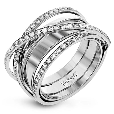 This modern, dynamic ring features an overlapping design of shiny high polished 18k white gold and rows of sparking white diamonds. The ring contains .50 ctw of round diamonds.