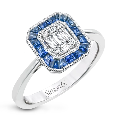 This white gold ring recalls the charm of a past era with a halo of custom-fitting sapphires surrounding a mosaic of .18 ctw diamonds.